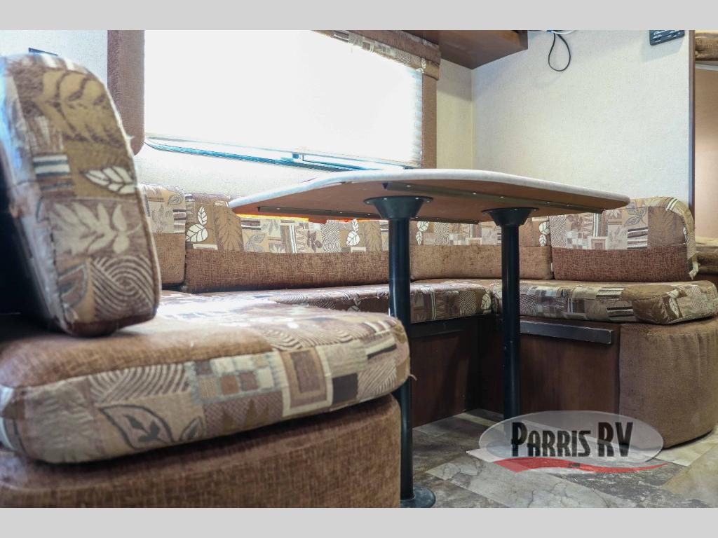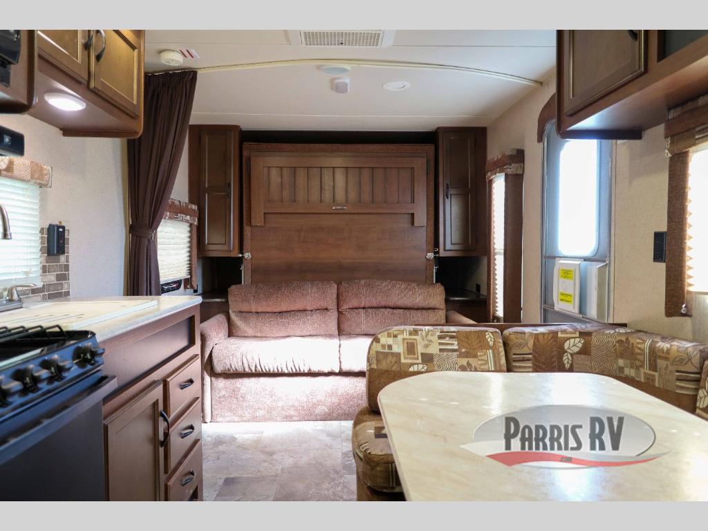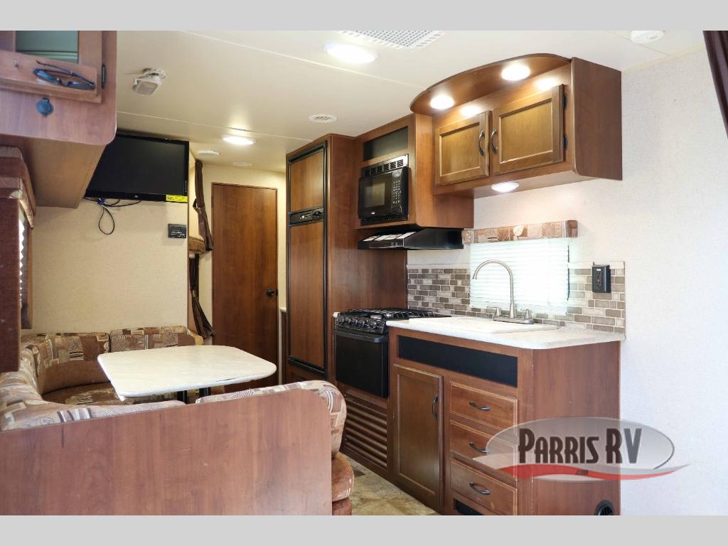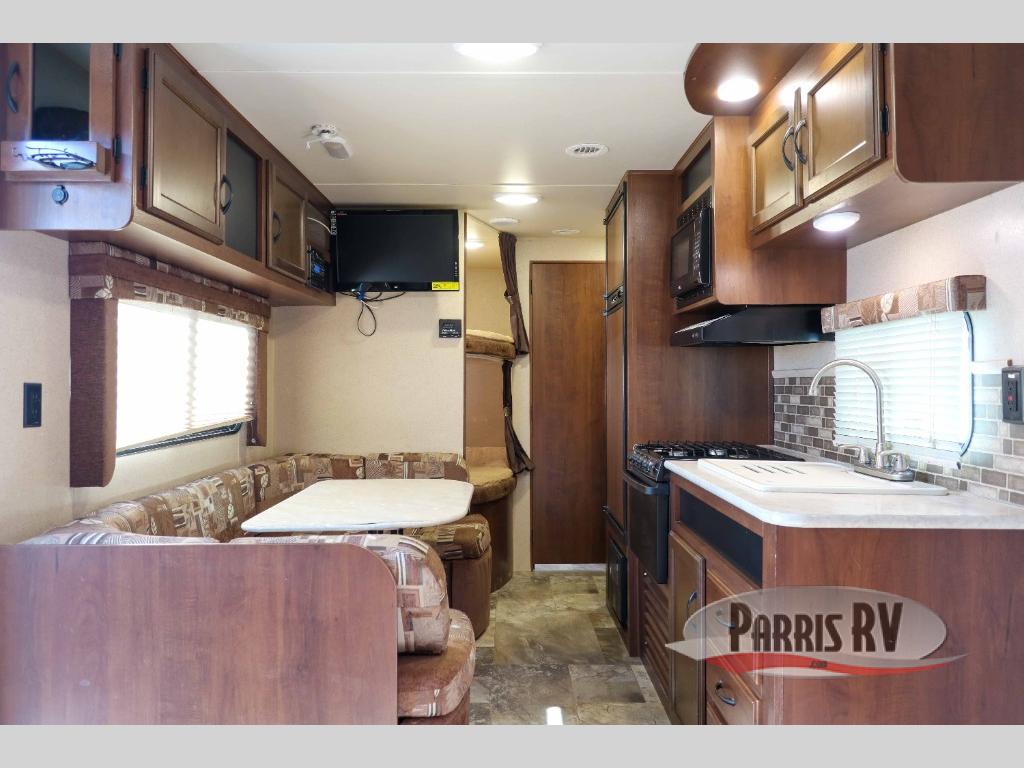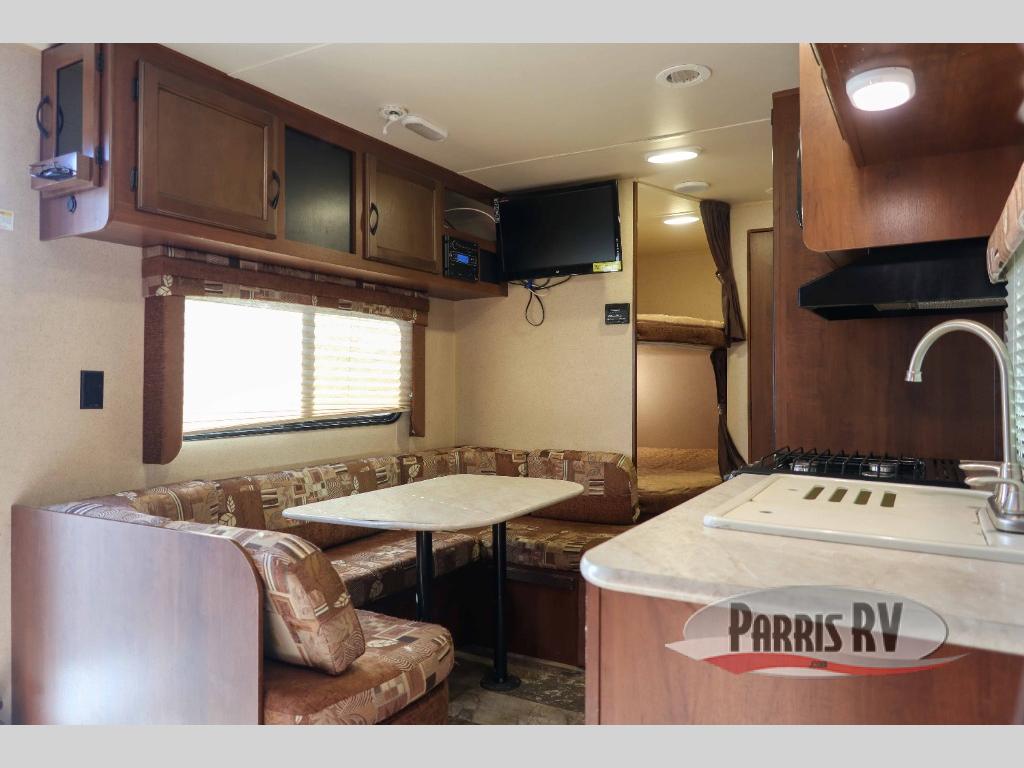 As you enter the travel trailer, to the left there is a u-dinette. Next to the dinette you will find a double bunk bed. The opposite side of the trailer has a double kitchen sink, three burner range, microwave, and refrigerator.
