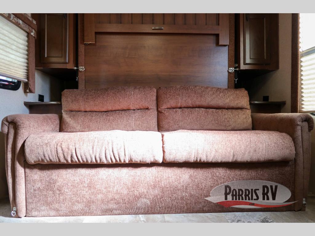 In the front of the trailer there is a sofa with a Murphy bed behind the sofa and wardrobes on either side of the bed.