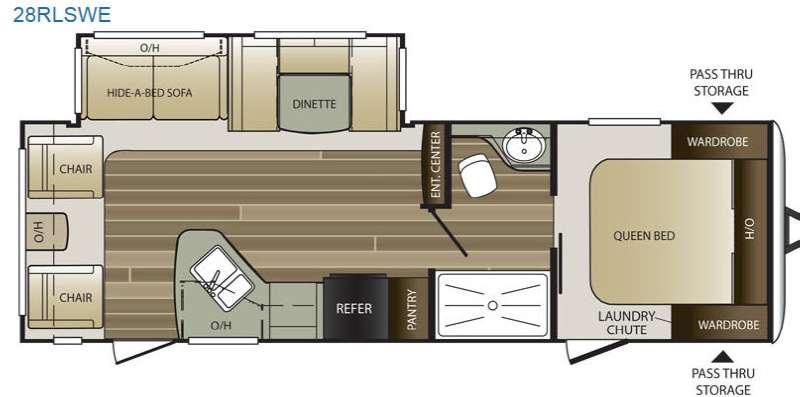 Enter the rear most side door and find two lounge chairs plus an end table between along the rear wall. There is also an overhead cabinet the entire width of the room to help keep things neat and organized. Straight ahead you will find a hide-a-bed sofa and u-shaped dinette slide out for seating and added sleeping space at night. Both can easily be converted to sleeping. There is also an entertainment center along the interior wall for your enjoyment.