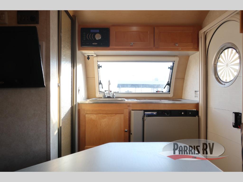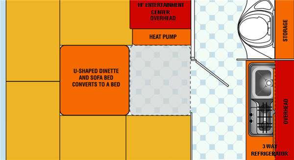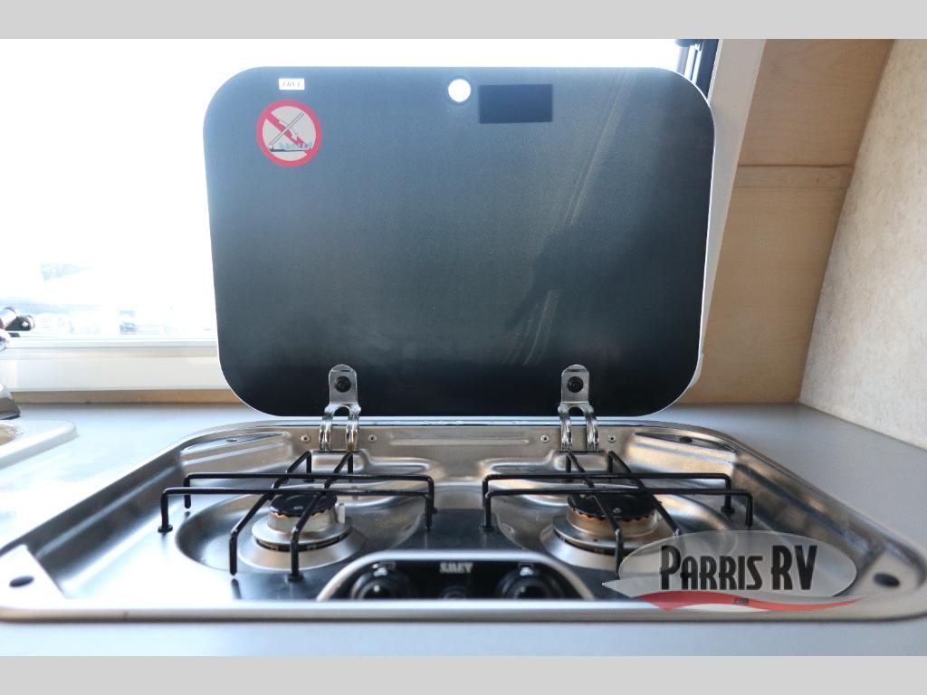 Start with the kitchen accommodations just inside the door on your right. Here you will enjoy cooking on the two burner stove-top, and your perishables will remain cold and fresh with the 3-way refrigerator. There is also a single sink, and plenty of overhead cabinets for storage.