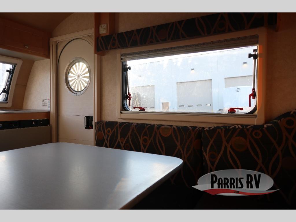 To the left of entry or the rear of this TAB teardrop S-Max unit find a u-shaped dinette with table which can easily convert to sleeping space at night. You will sleep comfortable even if it is warm with the wall mounted AC unit.