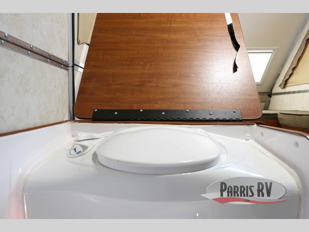 Along the road side of the pop-up there is a galley sink, two burner range where you can easily fix quick meals for your family, and a refrigerator under the counter. Enjoy your meal around the dinette, and at night you can get a good nights sleep on the 56" x 76" conversion bed, and more!