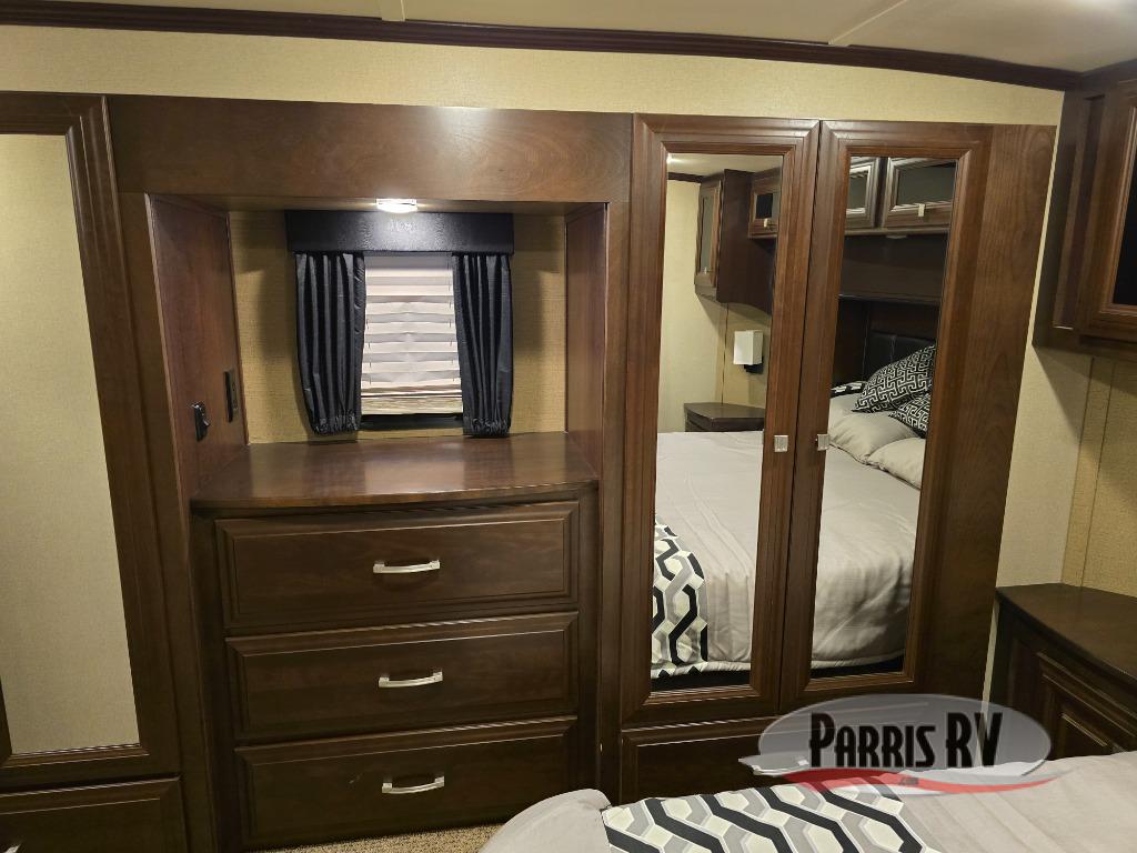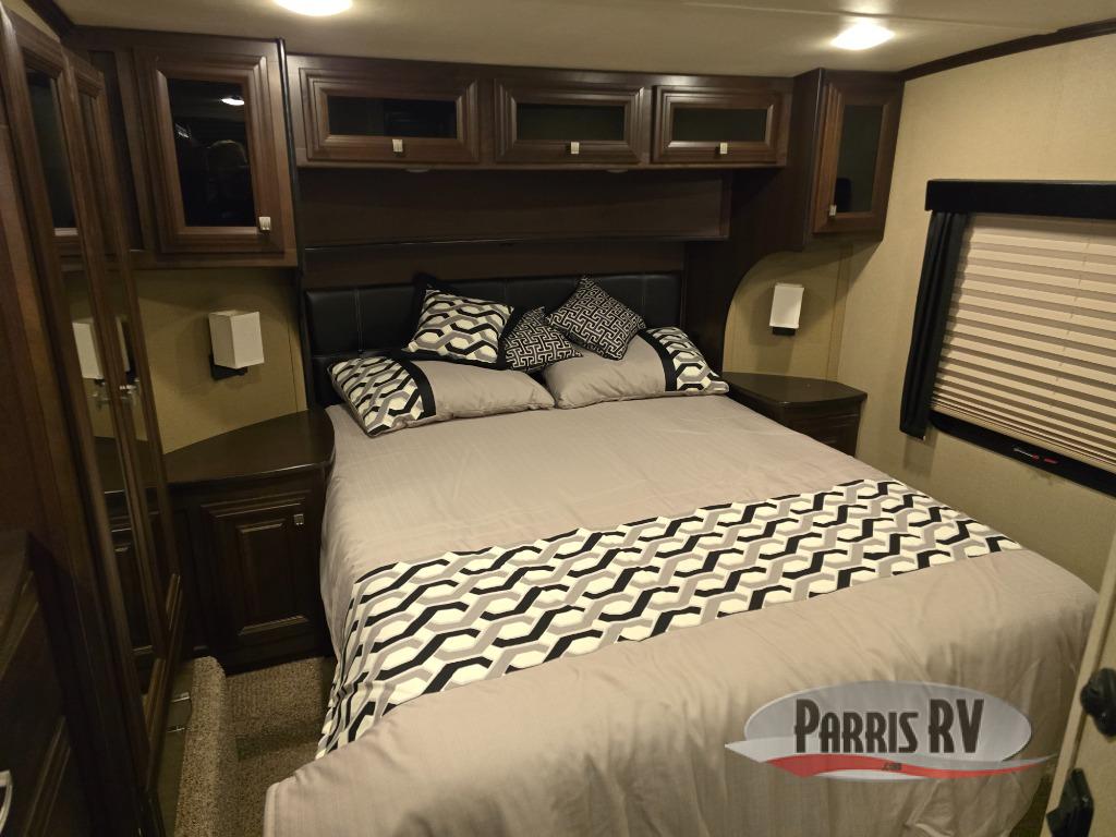 Inside the master bedroom enjoy a comfortable queen size bed with hinged top, dual nightstands, and a large slide out dresser that is flanked by two wardrobes.