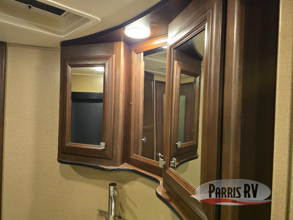 Pass through the door in the cargo space, or head around to the main side entrance and find all the floor space you need to kick back and relax when you are not out on the trails. The kitchen area is to the left of the door and features an L-shaped counter with double sink, a three burner range with overhead microwave, a 12 cu. ft. refrigerator, and two pantries for food storage needs.