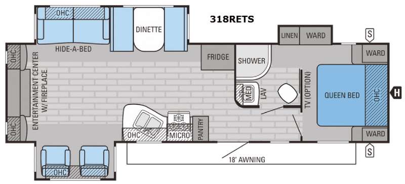 As you step inside to the left is a pantry, three burner range, microwave, and an angled double kitchen sink and countertop. There is a slide out with two recliners or choose a second hide-a-bed sofa instead. The rear wall offers an entertainment center with fireplace and overhead cabinets. There is another slide in the main living area with a hide-a-bed sofa and booth dinette. You may also choose a table with chairs in place of the dinette. Next to the dinette you will find a refrigerator.