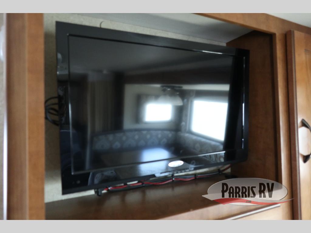 The galley is located along the door-side wall and includes a refrigerator, three burner range, and round galley sink with overhead cabinets for dishes and things. The large slide out u-shaped dinette opposite the galley will easily seat five for meals comfortably. You can also enjoy watching TV from the dinette because the entertainment center is conveniently located nearby.