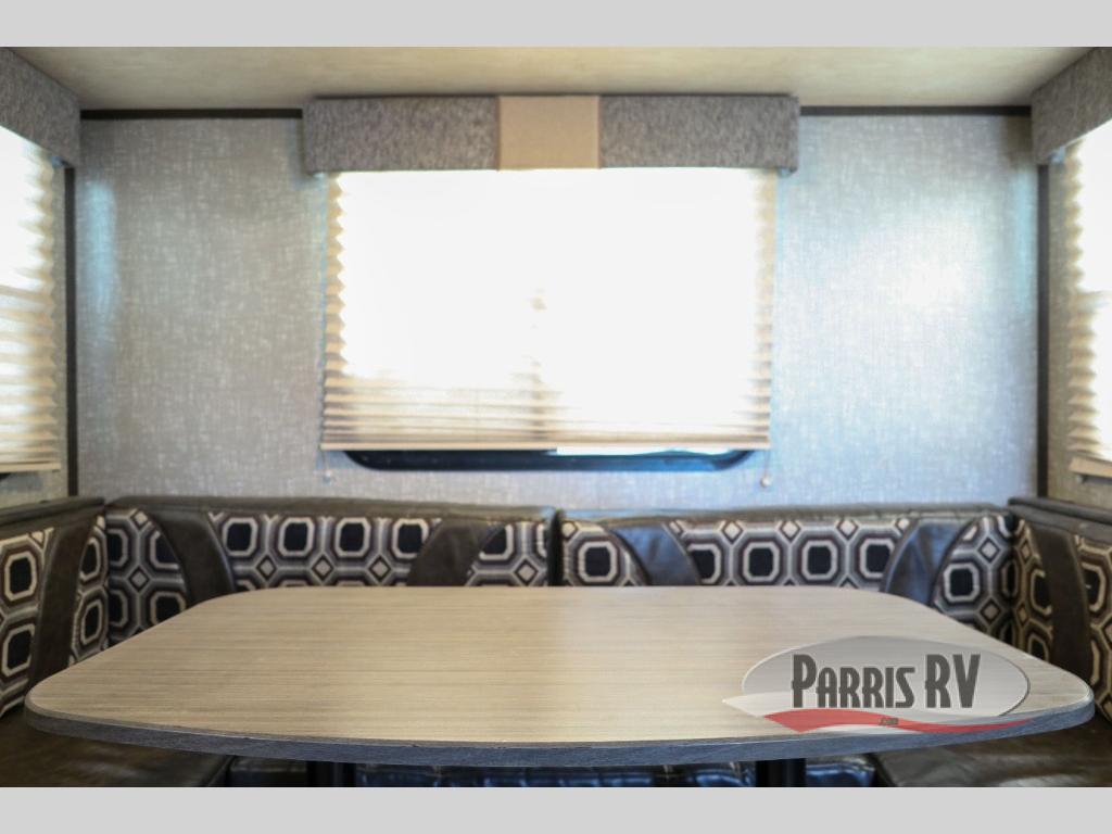 A large u-shaped dinette slide provides a grander walk space from front to back when it is extended. It features ample seating for the whole gang to enjoy meals together, or a board game, plus just hanging out.