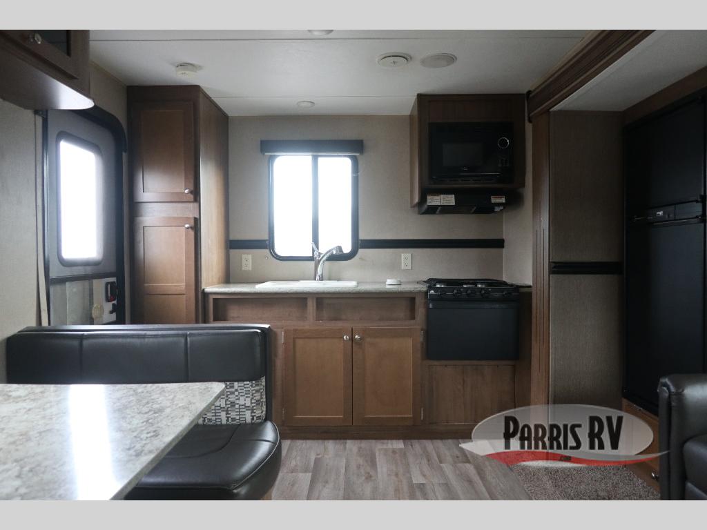 Step inside the rear most entry door and find yourself in the kitchen. There is a pantry, double kitchen sink, 3 burner range and microwave along the rear wall. The refrigerator is off to the side in the single slide out with a 68" sofa. There is a dinette just inside the entry door on the right.