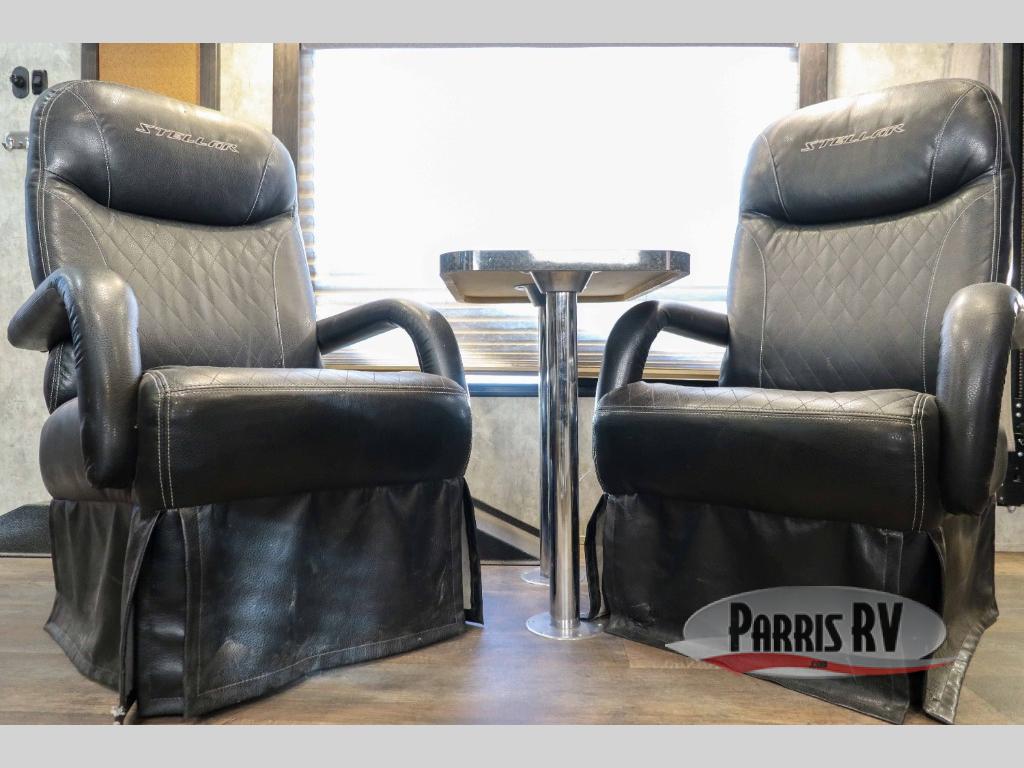 Moving toward the rear of this model, you will find a sofa with an overhead cabinet along the roadside. There is an optional slide out for the sofa, if you prefer more floor space. Along the door side there are two lounge chairs, an end table, and a large overhead cabinet for your belongings.