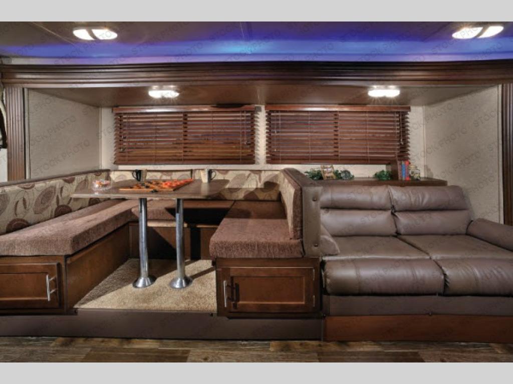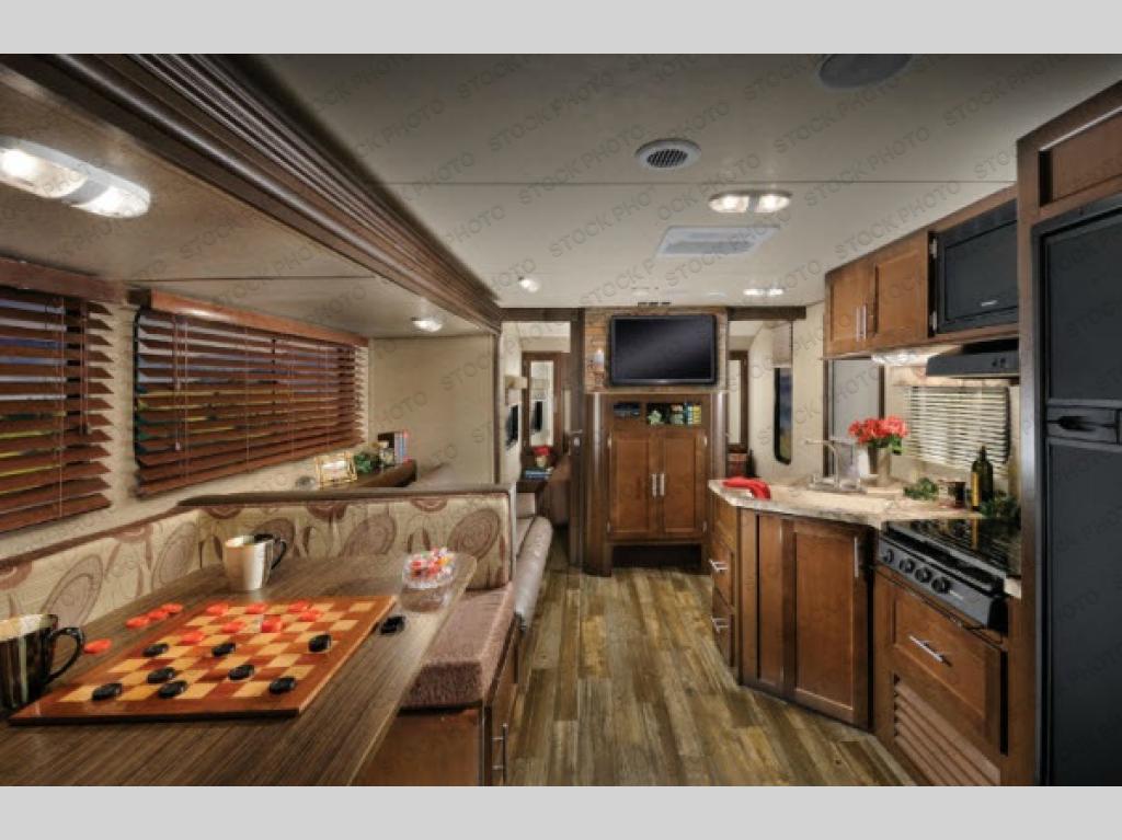 The living area offers a slide with a u-dinette and sofa. Along the front there is a LCD TV mount. The kitchen has a large sink, three burner range, microwave, refrigerator, and large walk-in pantry.