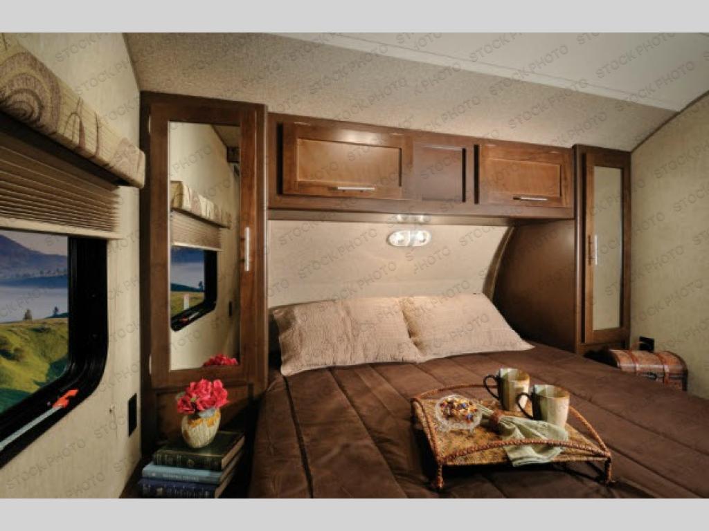 As you enter the travel trailer, the bedroom is in the front. There is a queen bed and two wardrobes. Also find accordion doors on either side of the TV mount for added privacy.