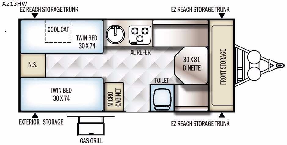 Storage can be found outside the camper with the EZ Reach storage trunk up front as well as in the rear. Also, you can enjoy grilling with the gas grill, and more!
