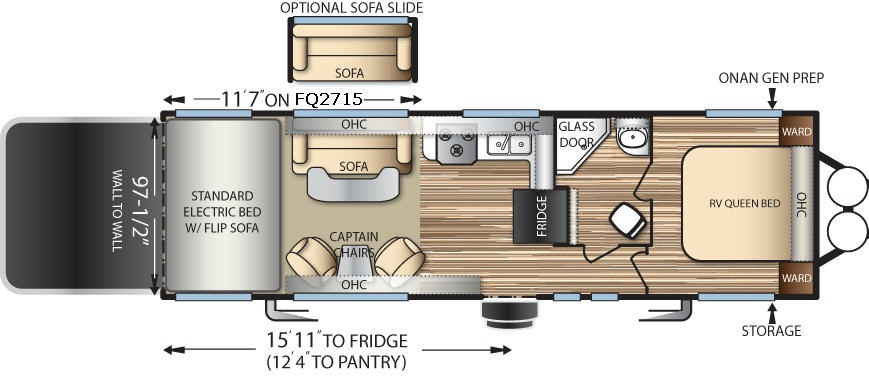 As you move forward, there is a sofa with table and overhead cabinets along the road side. You may choose an optional sofa slide for even more interior floor space if you wish. The opposite side has two captains chairs with a table between them, as well as overhead cabinets for storage.