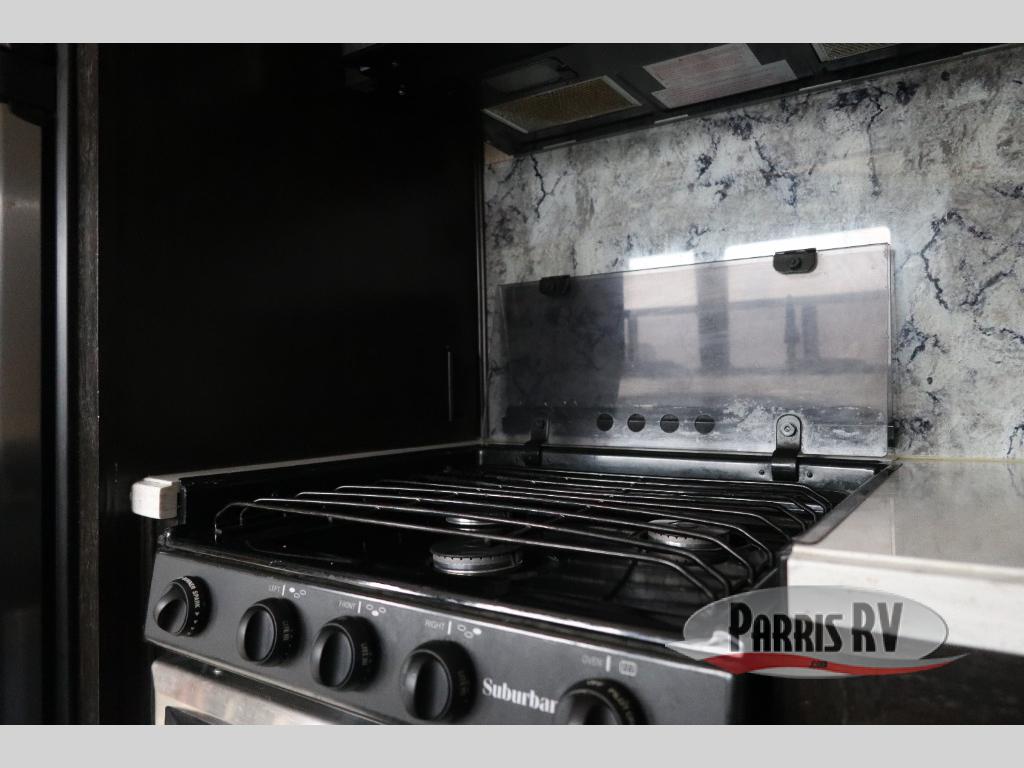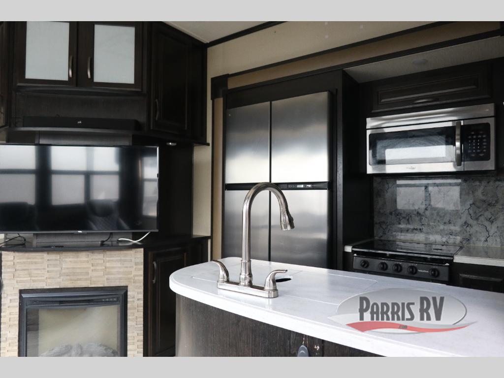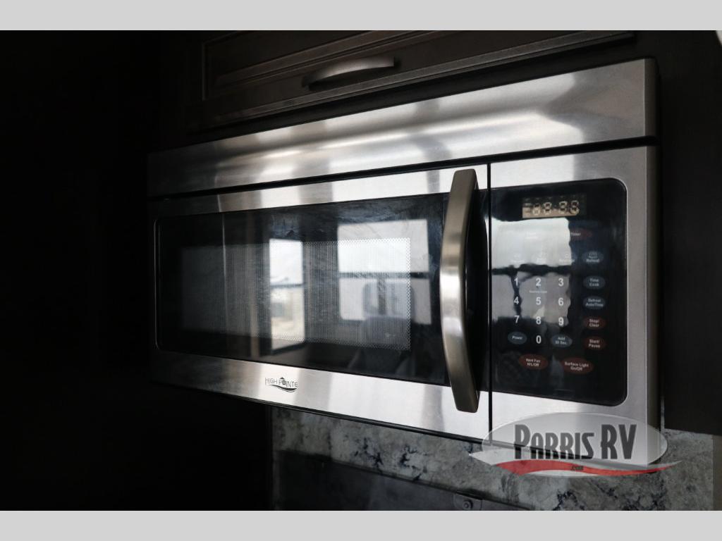 The kitchen offers all the amenities you need to enjoy spending time on the road. There is a slide out 18 cu. ft. refrigerator, three burner range with overhead microwave, and a counter peninsula along with a kitchen sink, and storage both above and below the counter.