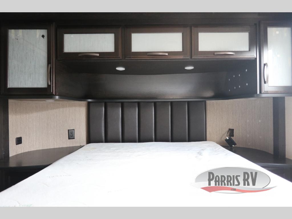 The door at the head of the hall leads into the front bedroom which features a queen size bed or choose a king, nightstands, overhead storage, and a slide out wardrobe with dual drawers.