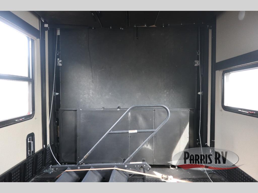The 11' garage features a rear ramp door for ease in loading up the toys. When the toys are removed you have an option of adding a happi-jack bed with dual roll-over sofas/table for added seating and sleeping space while camped. There is a side man door for easy access when the rear ramp door is closed or patio is raised.