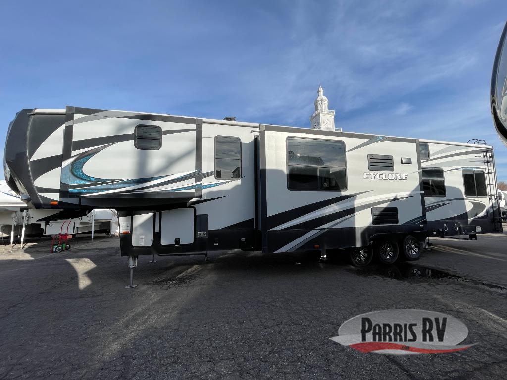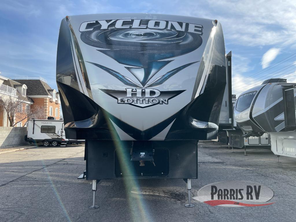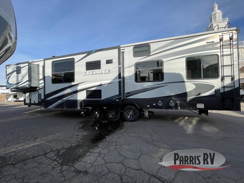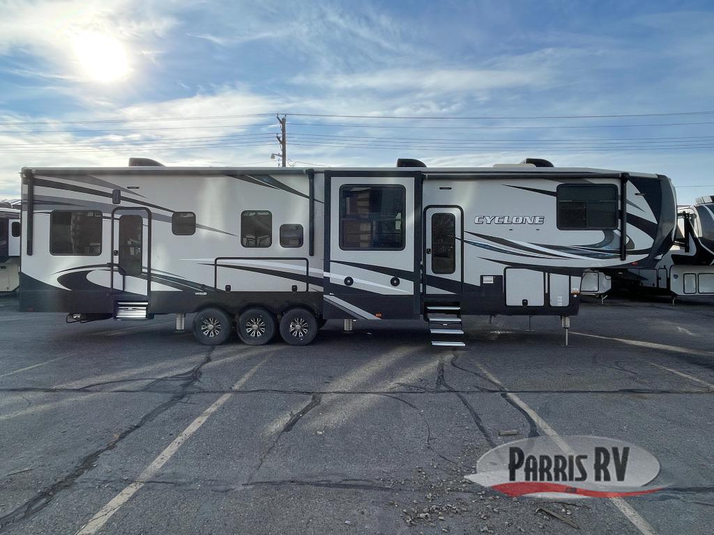 If you are looking for 13' of cargo space with a loft and half bath, dual entry for convenience, and an outside kitchen, plus all the amenities you need to relax after playing with your toys then take a look at this Heartland Cyclone 4005 toy hauler fifth wheel.
