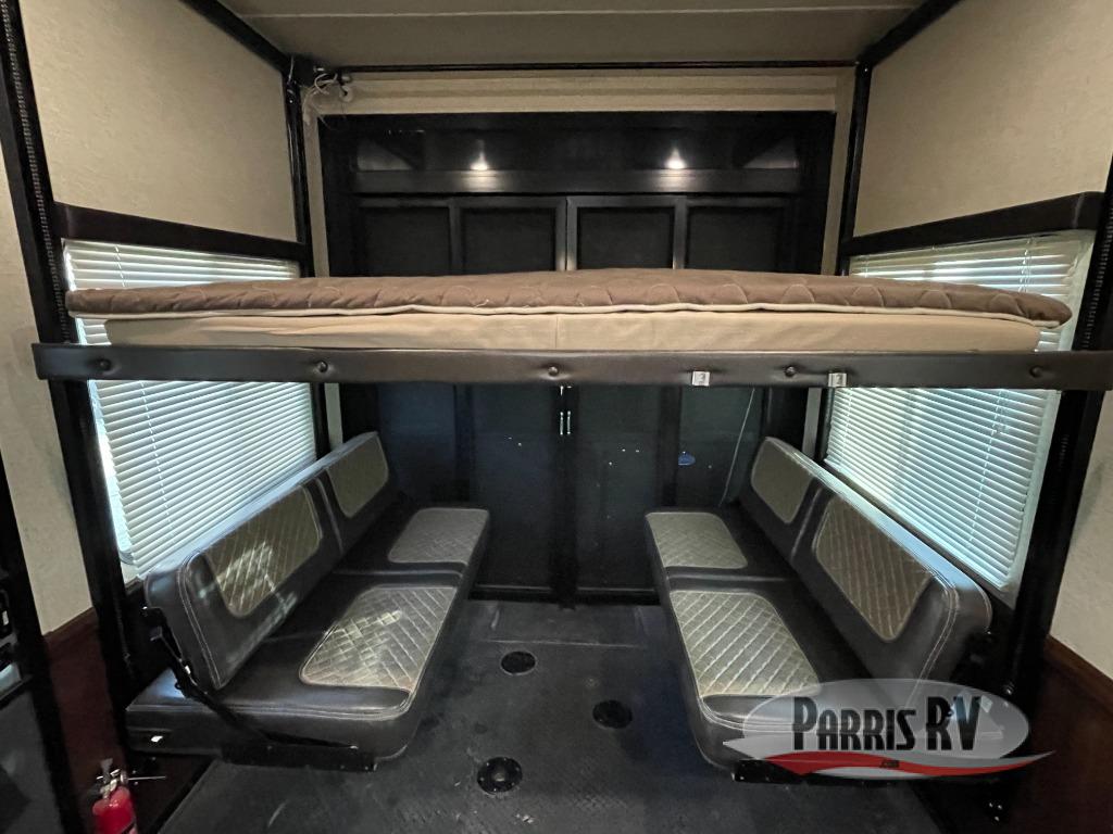 This model features a rear ramp door to make loading and unloading a breeze. The electric queen bed with convertible sofas and the loft with garage access allows you to take along a few family members or friends! You will also appreciate the side man door for quick access to your toys and the half bath.