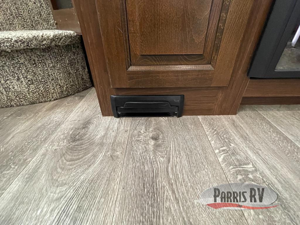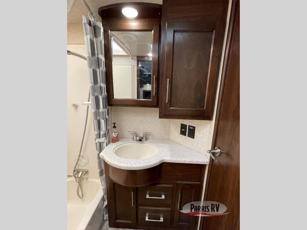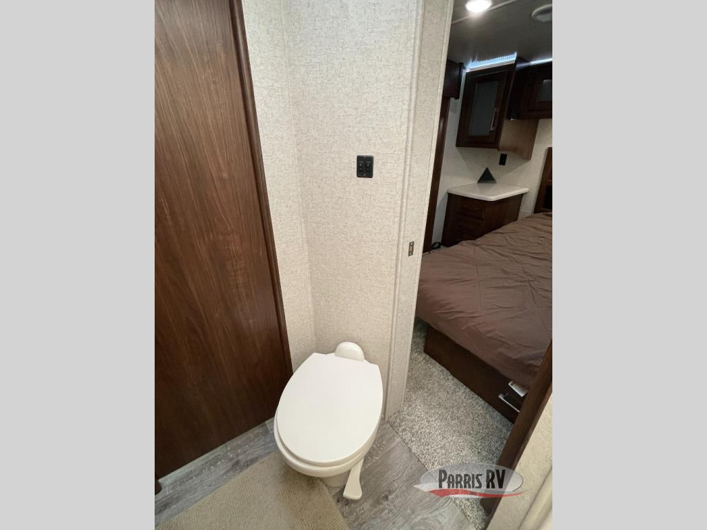 Step up to the side aisle bath including a shower, toilet, and sink. Pass all the way through with a convenient second door to the front master bedroom which features a king bed with storage on either side. There is also a slide out linen cabinet, and wardrobe with drawers and counter area.