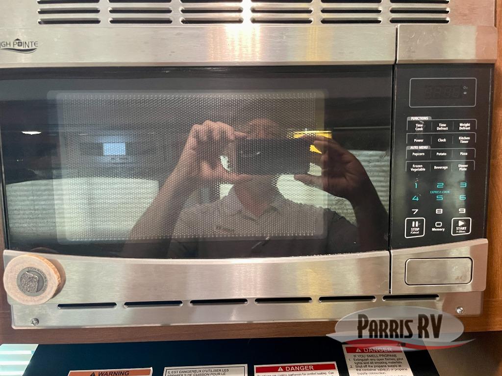The living and kitchen areas offer a slide with a u-dinette and sofa. Along the interior wall you will find an entertainment center and a bench with storage. There is also a double kitchen sink, three burner range, microwave, refrigerator, and pantry along the curb side wall.