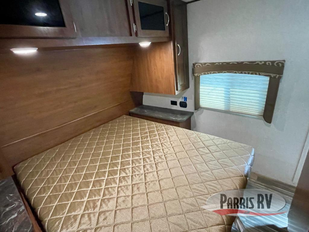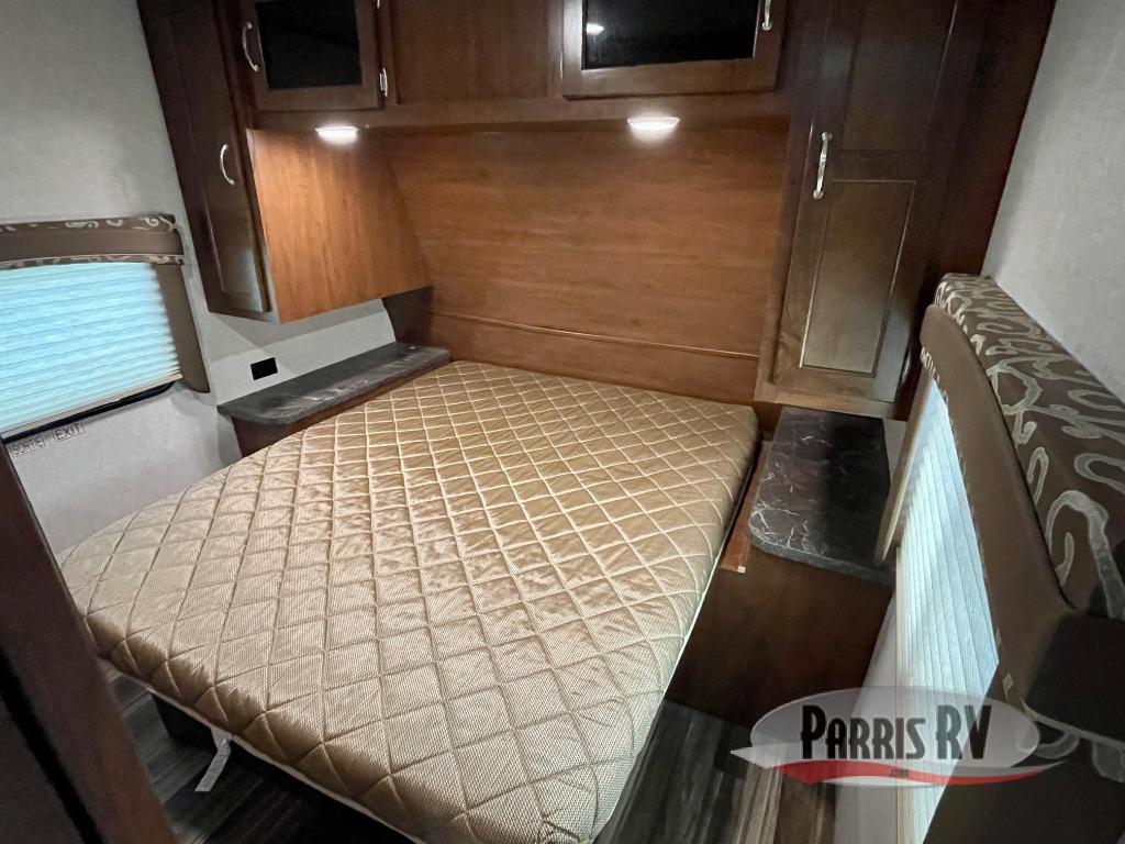 Stepping inside the travel trailer, the front bedroom is to your right. Inside the bedroom, you will find a comfortable queen bed and two wardrobes, one on either side of the bed, and an overhead cabinet above the bed which helps to keep things neat and tidy.