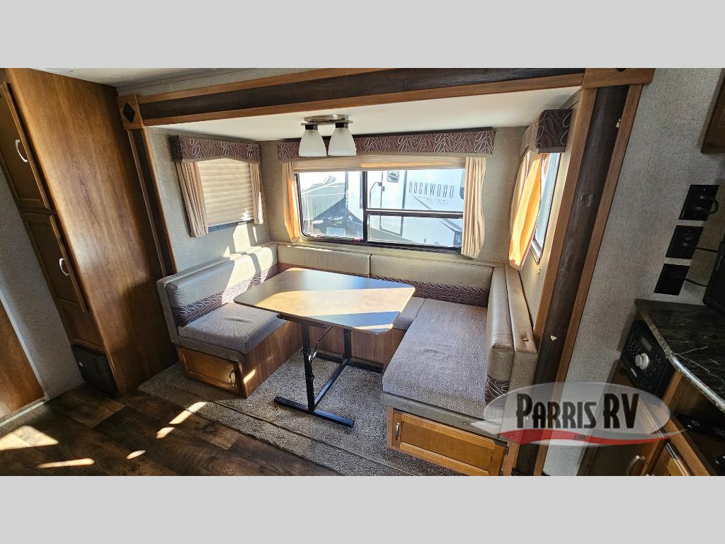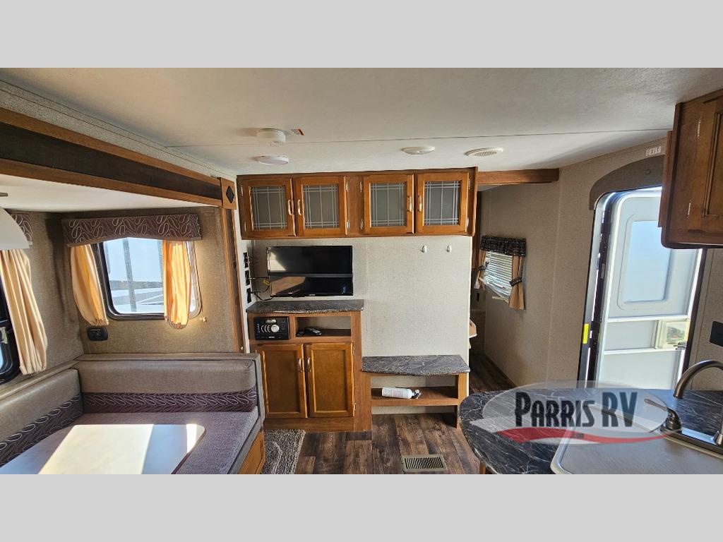 Just outside the bedroom door on your right you will find a bench seat with coat hooks above, and an entertainment center to enjoy. Adjacent a slide out u-shaped dinette provides ample seating for mealtime or just hanging out. You can also quickly transform the dinette into added sleeping space if needed at night.