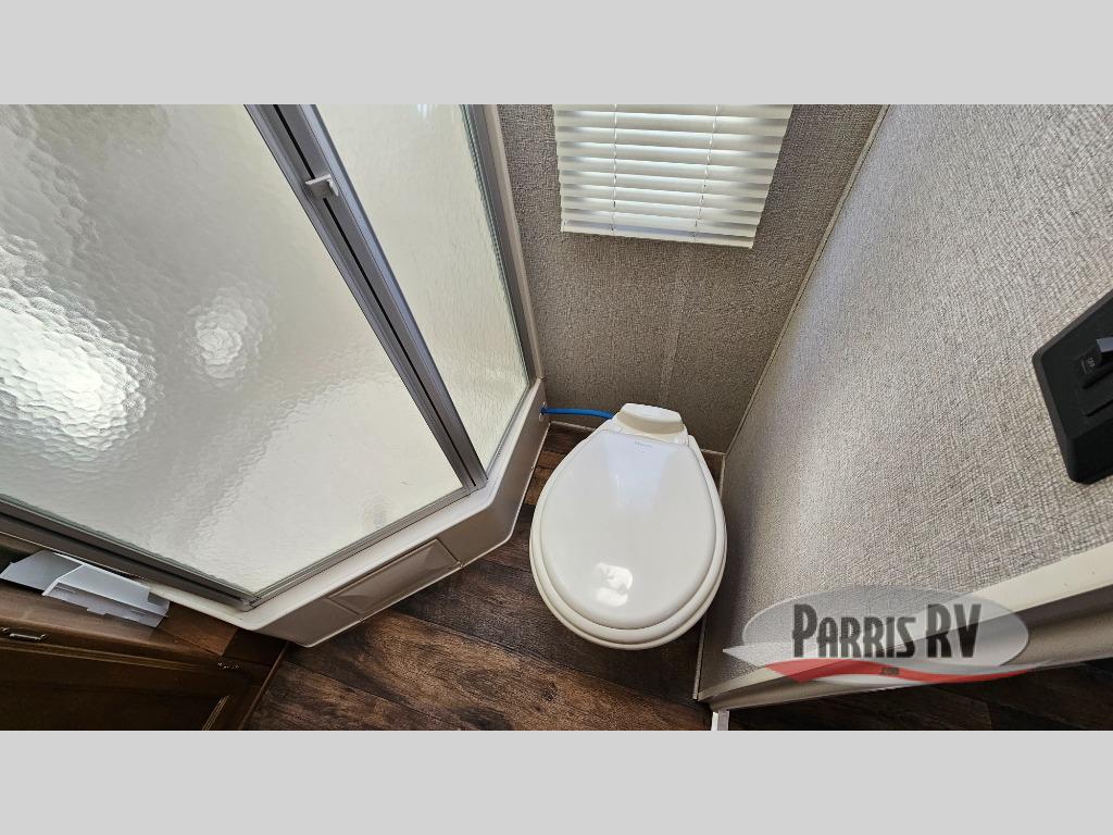 The rear bath is spacious and features an angled shower, a toilet, and a vanity with sink. You will truly love this convenience as you travel. No late night run to the campground bathroom here!