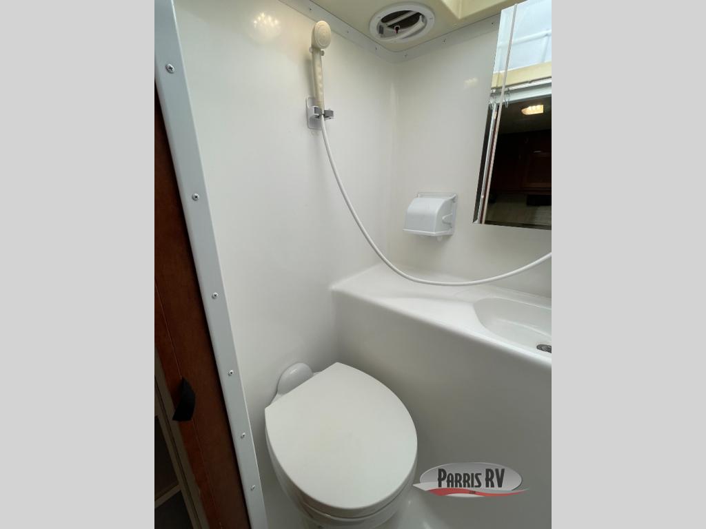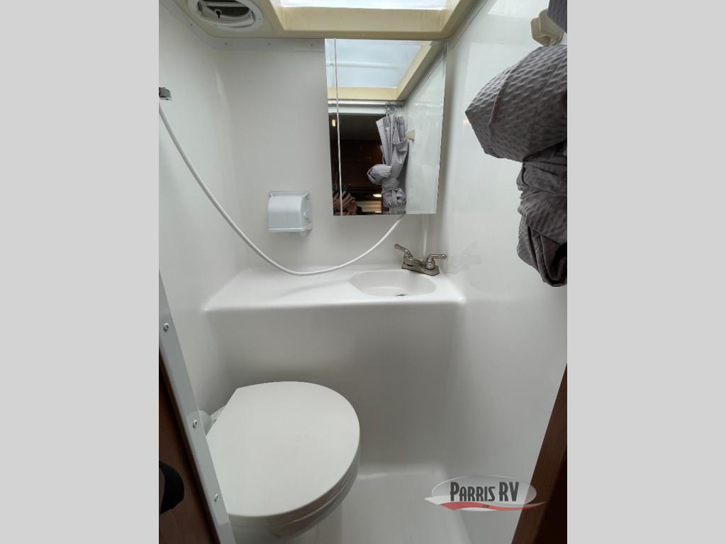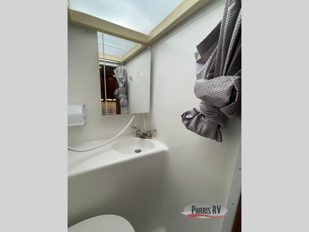 There is a rear wet bath to your left as you enter that includes a toilet, sink and shower.