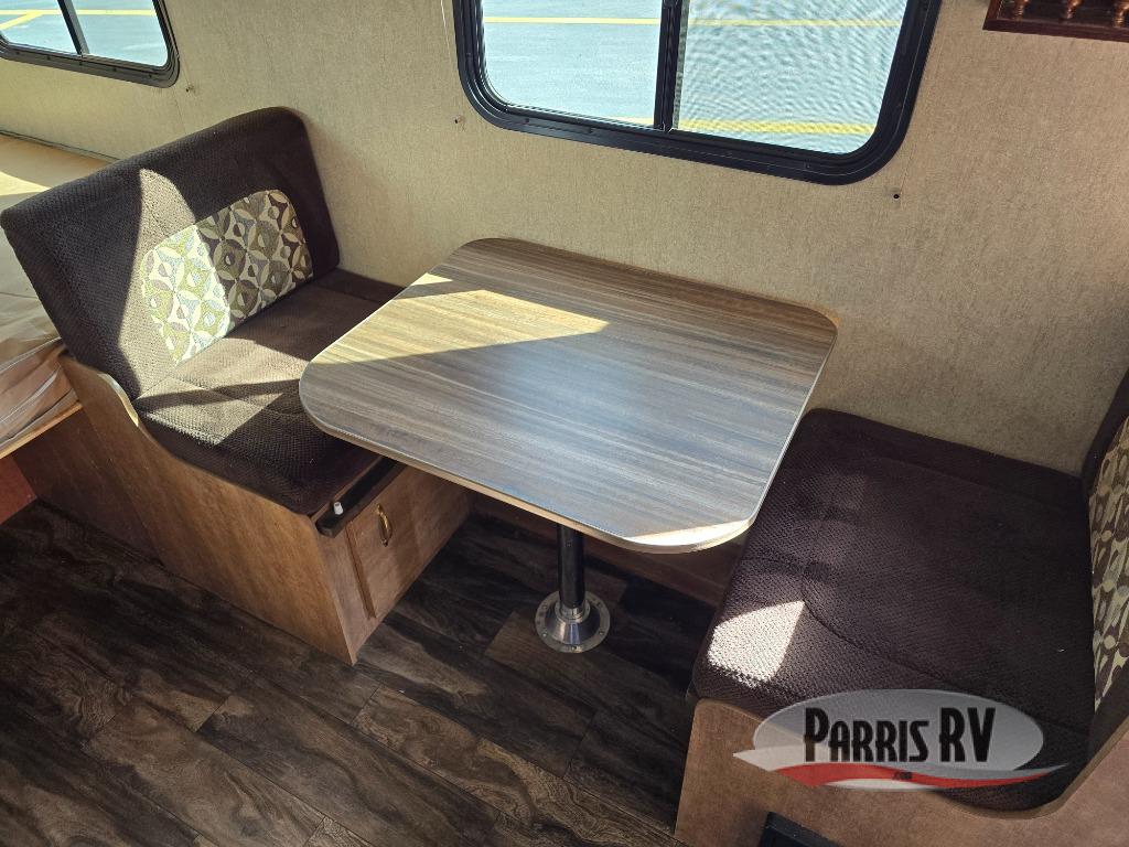 The slide out along the road side features a sink, a two burner range, a refrigerator with an overhead microwave, and an overhead cabinet where you can store dishes. Across from the slide out is the dinette and overhead cabinet, and located along the very front of this model is a queen bed.