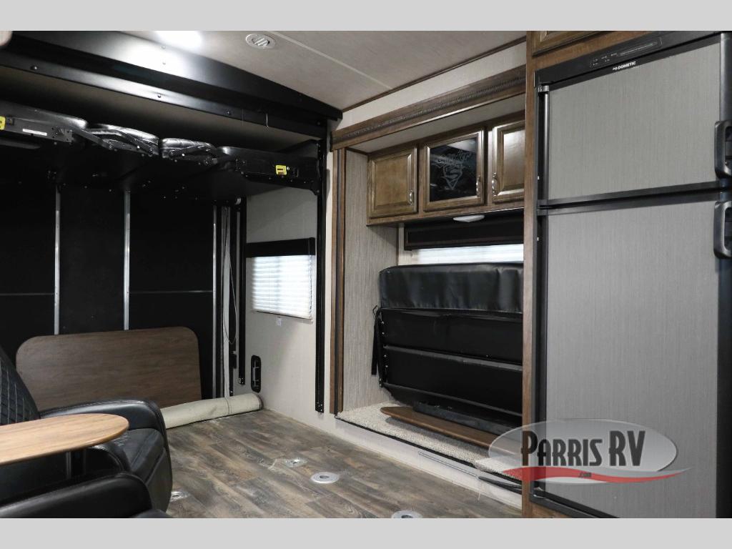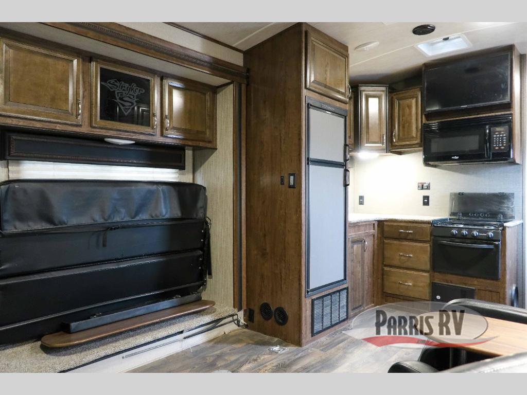 The Stryker line is all about family fun! The foundation is powder coated steel frame with lamination that lasts because it uses high-density block foam insulation. You are going to be able to stay for an extended season because of the Flex foil insulation in the floor and the separate heat duct that allows you to camp in cooler weather. All of these heavy duty components that Stryker toy haulers have provides lower maintenance, longevity, and more reliability. Choose your unit today!