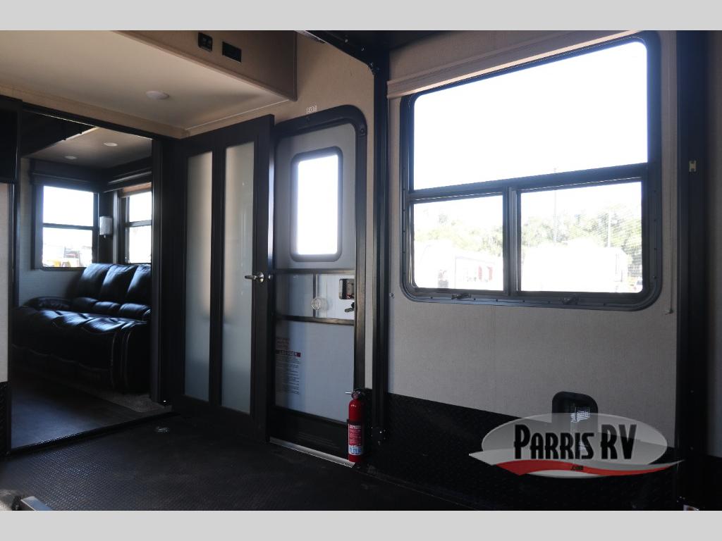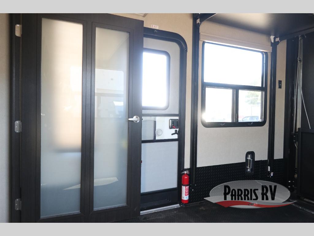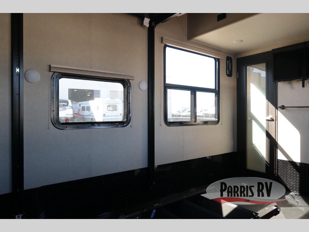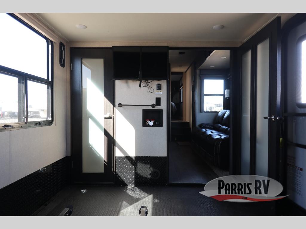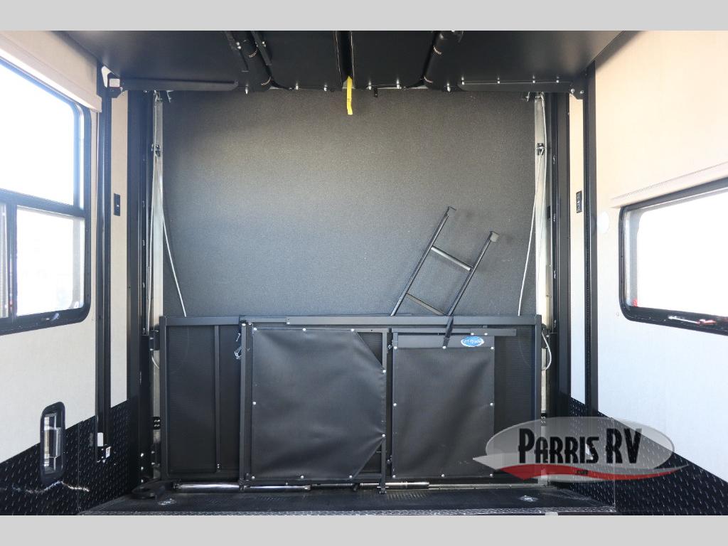 Having some at-home conveniences while you are camped is always a nice touch, but this Voltage FW toy hauler features a few extras that you are sure to enjoy! Eleven feet of cargo space is perfect for hauling dirt bikes, or a quad, and the 30 gallon fuel station makes it easy to keep the fun going all weekend long! Your down time will be enjoyable as well with plenty of seating, sleeping space, and a full kitchen, plus more! Check out the generous storage space toward the front beneath the bathroom and private front bedroom. Here you have storage space that is accessible from both sides, as well as ample wardrobes, overhead cabinets, and storage beneath the front queen bed. For those that love being outside, the outdoor entertainment center offers you a protected outdoor living space you are sure to enjoy! You can even convert the zero gravity garage door to a raised patio with a few options so you can kick back and enjoy the view that you have chosen!