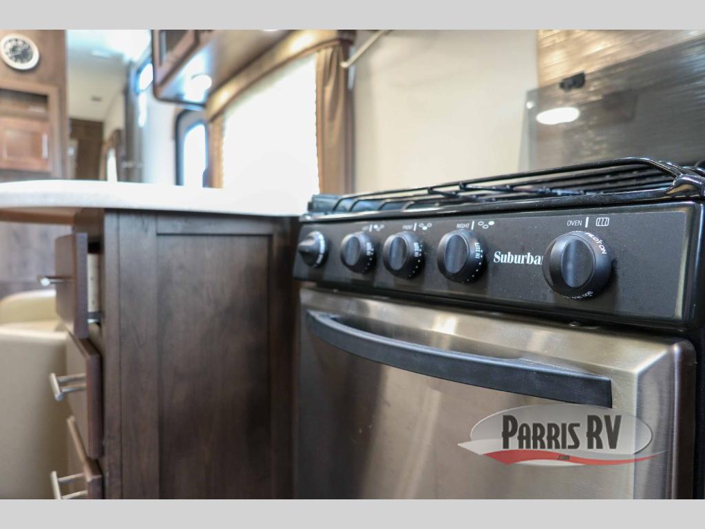 The kitchen area is located along the rear of this model. Just past the lounge chairs there is a L-shaped counter with a three burner range and a microwave. Continuing along the rear wall, you will find a double sink, refrigerator, and a pantry.