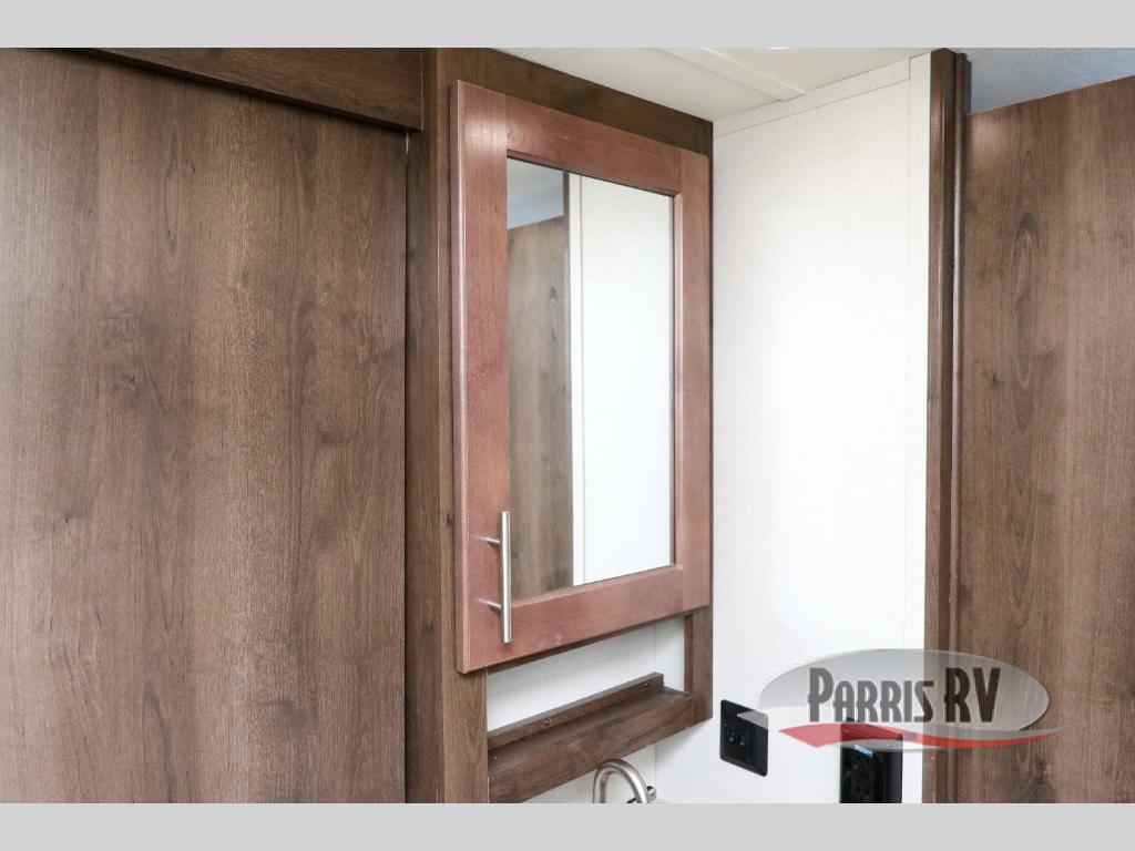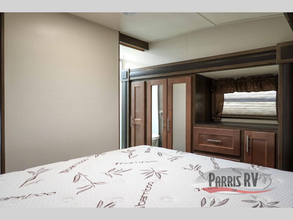 Step up to the bathroom and bedroom area. In the bathroom you will find a toilet, an overhead shelf, a 32" radius shower, plus a sink and medicine cabinet. A linen cabinet is part of the slide out which extends into the bedroom, and a sliding door closes off the bathroom from the front bedroom.
