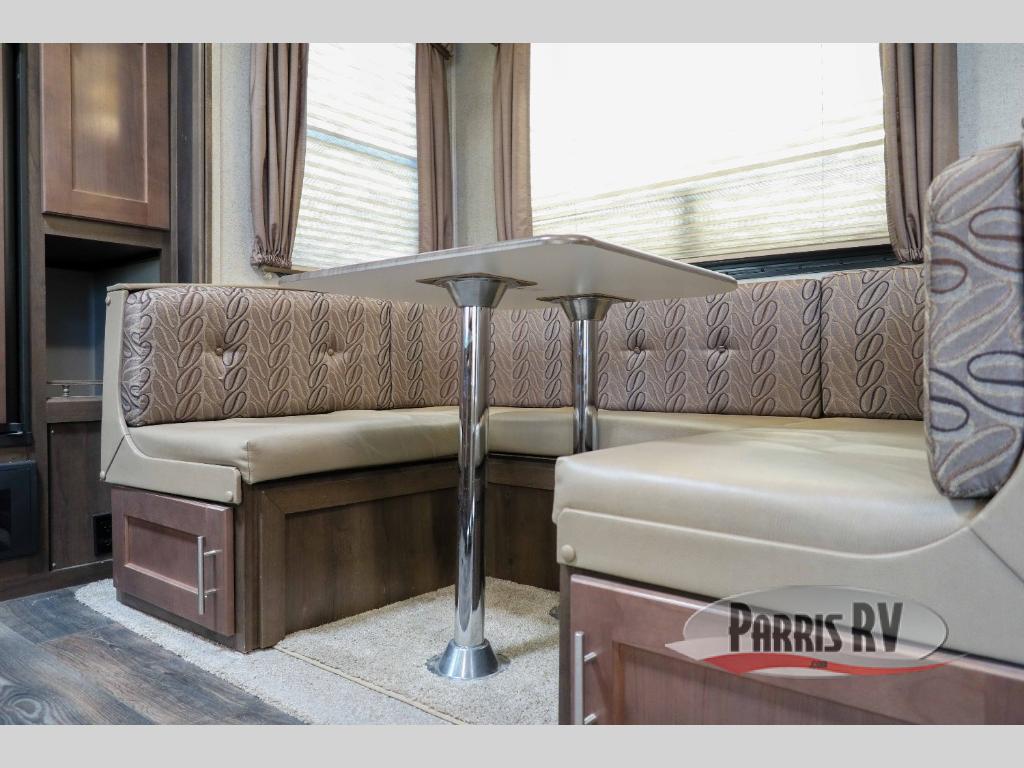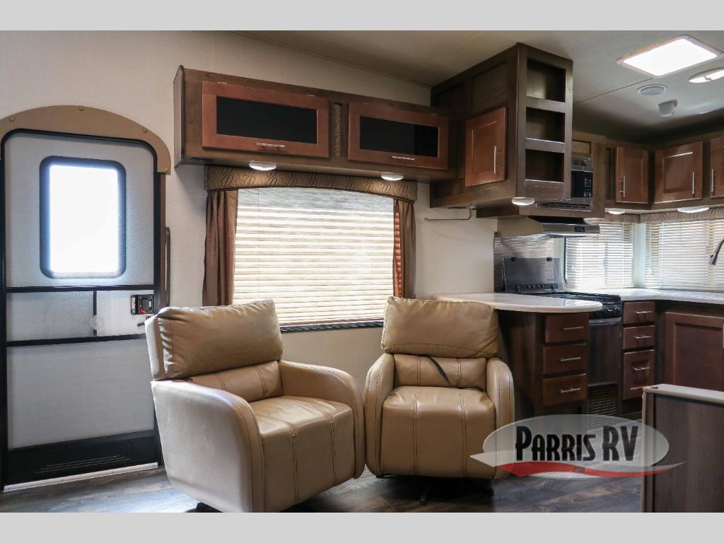 To the left of the entrance there are two lounge chairs or you can choose optional recliners. The opposite side of the fifth wheel has a slide out which really helps to open up the floor space. Within the slide out there is a sofa, an overhead cabinet, and a u-shaped dinette, or you can choose an optional free-standing dinette. Both the sofa and dinette easily convert into additional sleeping space at night. Adjacent to the slide out, along the interior wall is where you will find an entertainment center.