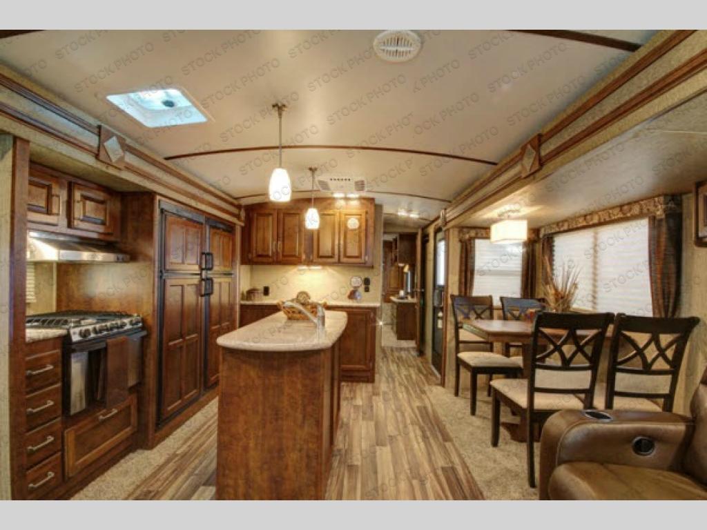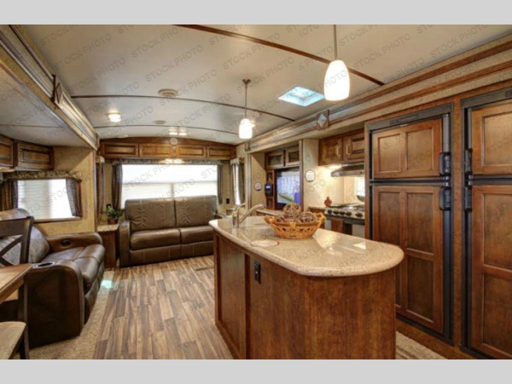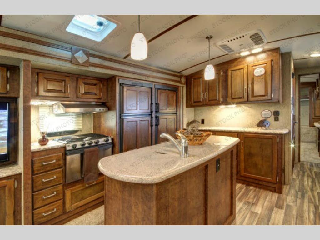 The slide opposite has TWO refrigerators, a three burner range, overhead cabinets, and an entertainment center. Along the rear wall there is a sofa sleeper with end tables and more overhead storage. In the middle of the kitchen you will find an island with a kitchen sink and extra counter and storage space. Straight in from the entry door you can store your dry goods in the large pantry along the interior wall.