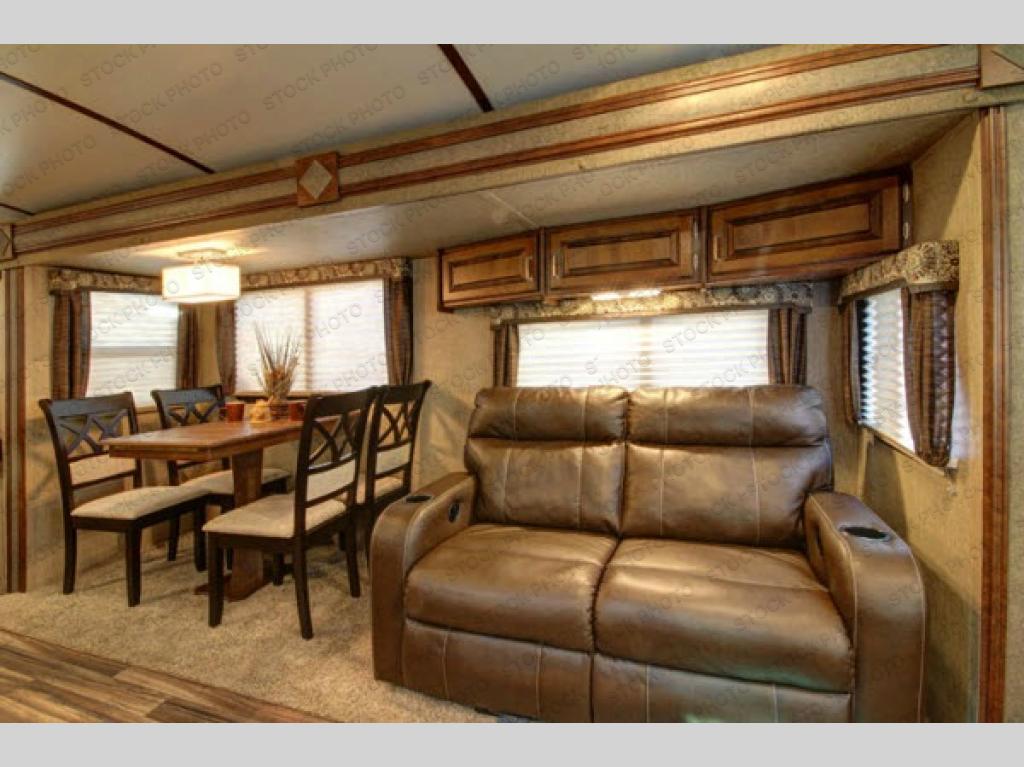 As you enter this Outback Super Lite travel trailer 328RL you will find dual opposing slides in the main living area which help to open up the floor space. The slide to the left has a dinette where you can enjoy your meals during the day and at night the dinette converts into a bed. There are also two theater seats with cupholders and an overhead cabinet.
