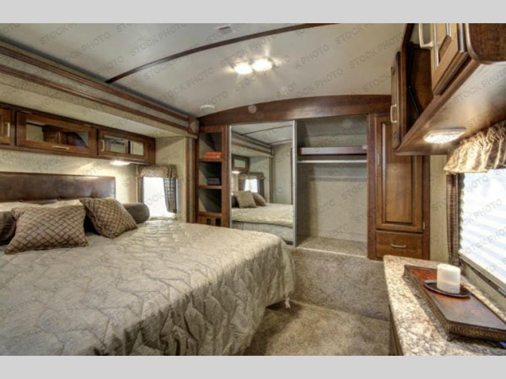 From the bathroom there is a sliding door which leads into the bedroom, or you can enter into the bedroom from the hallway. You will find a king bed slide out with overhead cabinets, storage, and a full width wardrobe including a space that has been prepped for a washer and dryer if you choose to add those appliances.