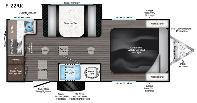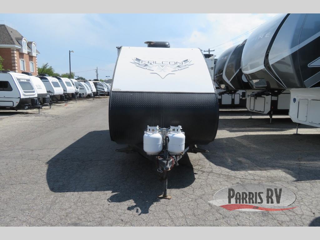 This Falcon F-22RK is the ideal couples trailer! With a rear kitchen and a front queen bed with storage below you will have everything that you need at your fingertips! There is a bit more floor space throughout this model thanks to the slide out along the roadside, plus you will find that the fully equipped rear kitchen is easy to use! Enjoy your meals at the dinette and at night you can easily convert this area into additional sleeping space! This unit also features a front bedroom with a queen size bed, plus there is a handy wet bath. Along with all of the standard features you can also choose the Eclipse Package, Fire Package, or the GT Package!