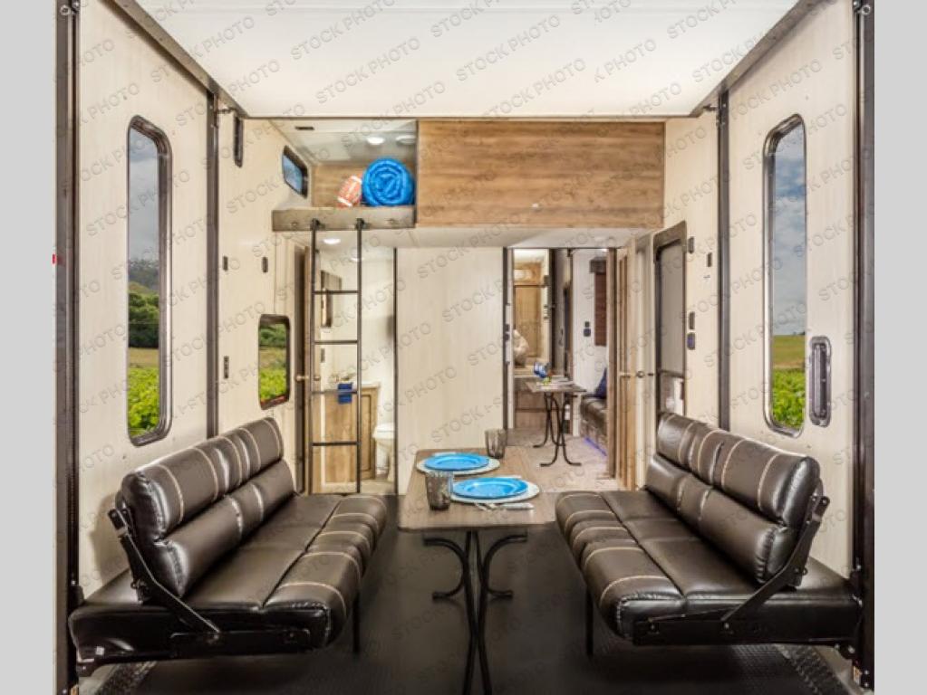 When you take this loaded fifth wheel with you on your family vacation, you won't stress out when you find out your kids have invited their friends because this model sleeps ten people, and with the master suite in the front, you will have a getaway from the chaos every night. The kitchen and living area is kept open because of two opposing slides, and if you need to relax for a minute while you are preparing dinner, you can sit down with a drink at the U-shaped dinette. The separate garage includes a HappiJac power bed and sofas, plus a loft with a queen bed and a ladder. The kids will even have their own half bath. There is more, step inside!