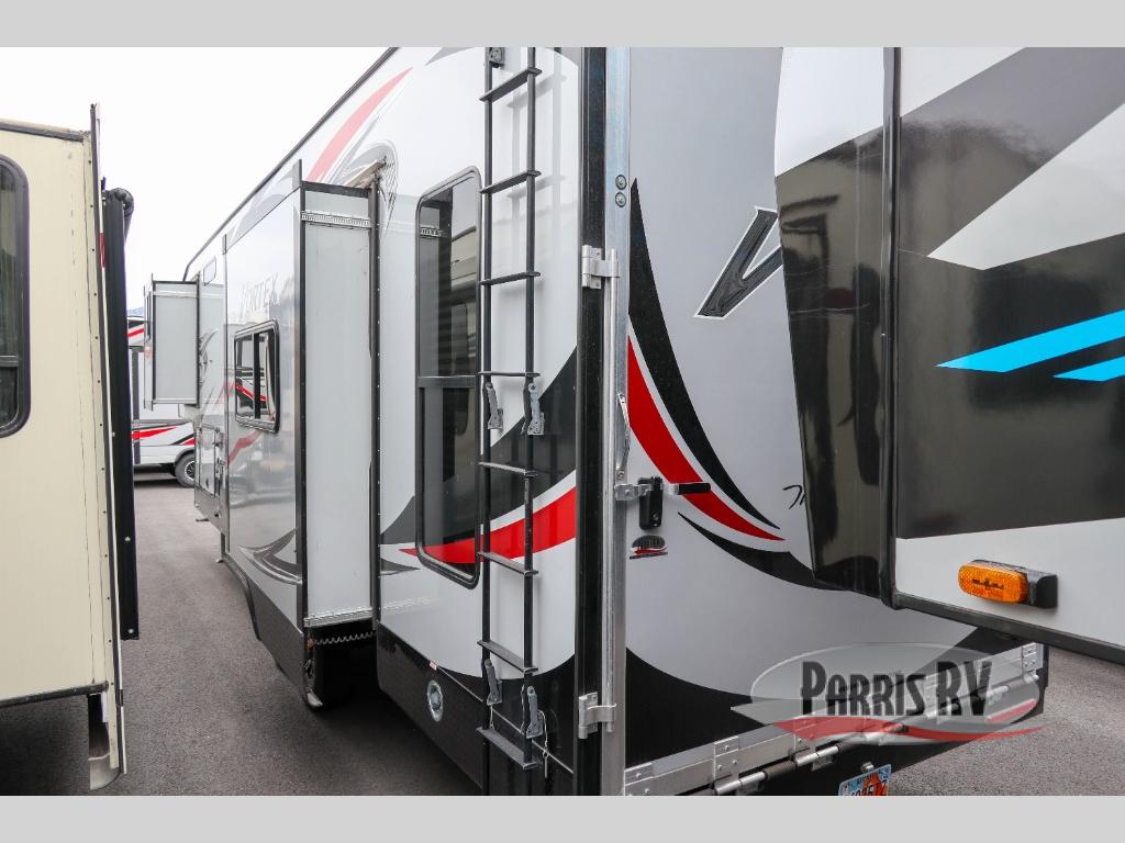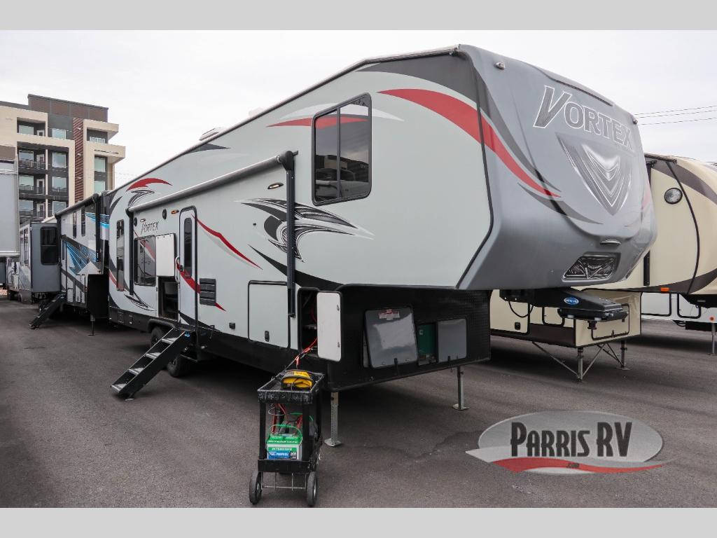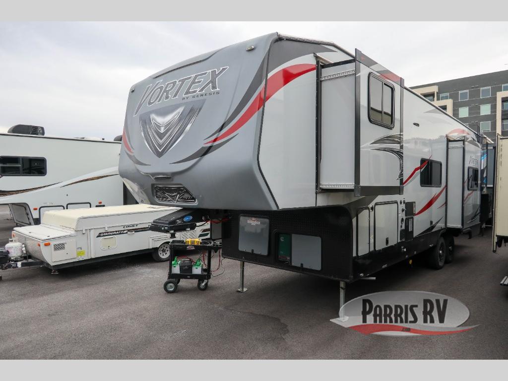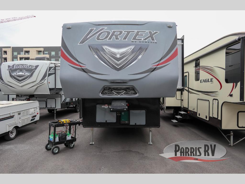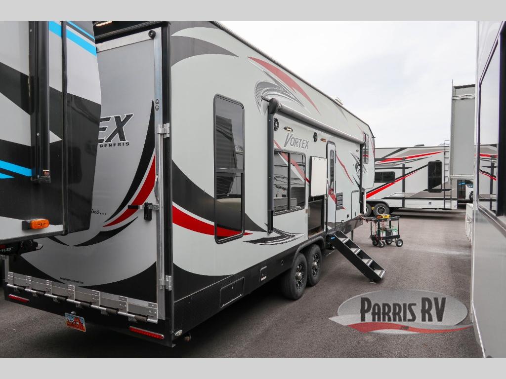 The Vortex by Genesis Supreme allows outdoor enthusiasts to enjoy luxury along with their toys in a toy hauler fifth wheel. You will appreciate the wide body for more interior space, more tie downs for your toys to be secure during travel, and the awning for protection from the elements. Inside you will find comfort from the living room air conditioner, and a pillow top mattress in the large master suite, plus more! It's time to find adventure for your thrill seeker side that also enjoys the finer things in your favorite Vortex toy hauler today!