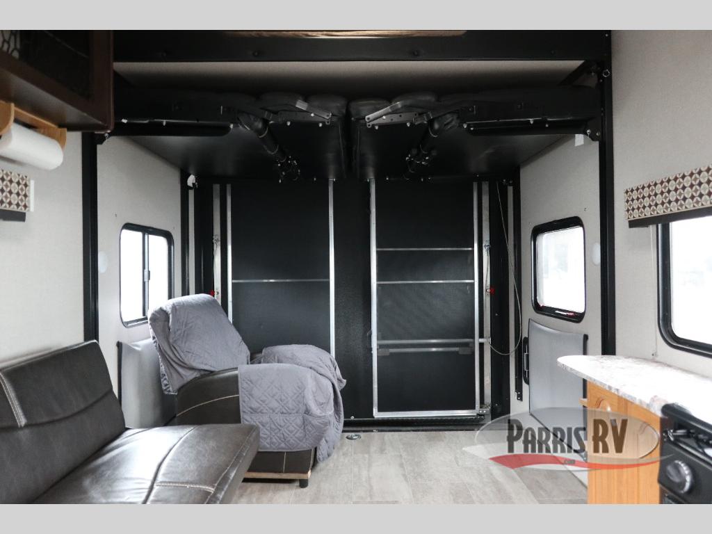 You won't find wasted space inside any of the Sportster fifth wheel toy haulers by KZ! They feature rollover sofas that fold up, pillowtop mattresses, a deep under-mounted sink with high-rise faucet, a microwave with turntable, and a 8 cu. ft. refrigerator. There is also Armstrong® ToughGuard® Linoleum throughout which is backed by a Dehco 3-year cold crack warranty. These toy haulers were built to last with the K-Z Exclusive Tough Shield .030 exterior metal, 8' wide body frame, 3/8 fully walk-on roof decking, a one-piece seamless roof with SuperFlex roofing material, and Equaflex suspension. You can enjoy your new RV with no worries because of the K-Z 24-month limited warranty that covers more than 1,500 operations codes.