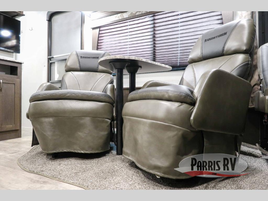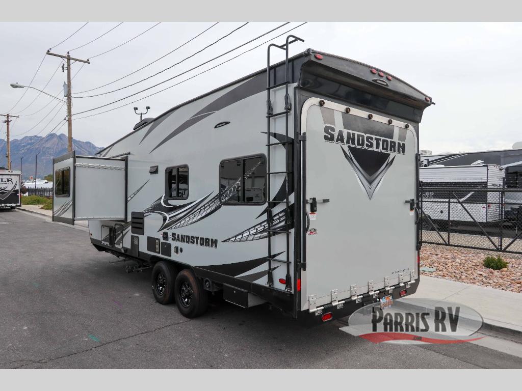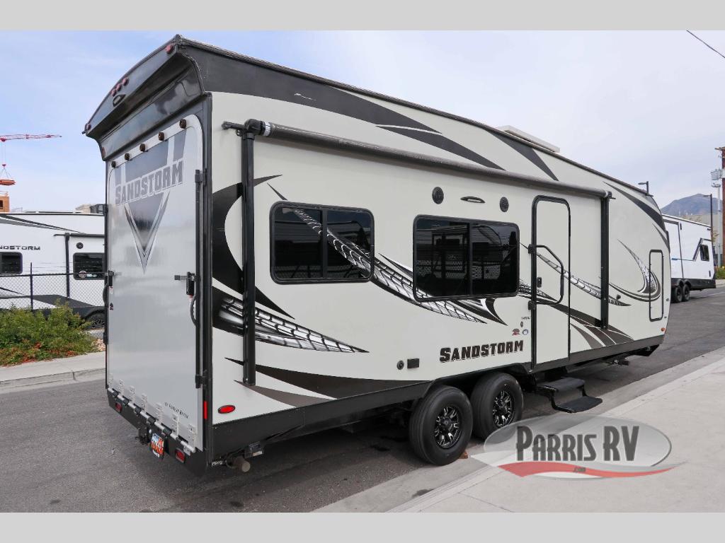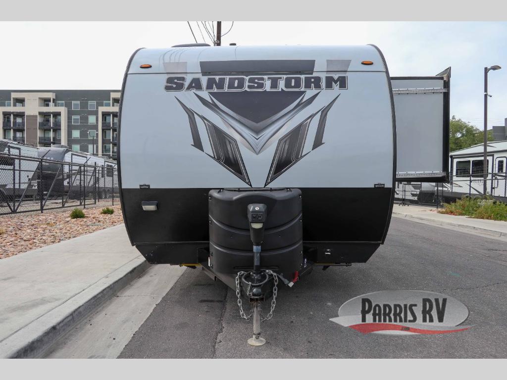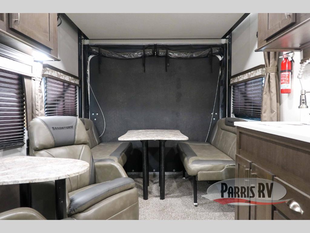 This Sandstorm toy hauler features a front private bedroom that is fit for a Queen with a queen-size bed, a dresser vanity with mirror, a wardrobe, and access into the dual entry bath! There is plenty of storage inside and out between the overhead cabinets and front outside storage area. After you have whipped up your best meal inside the complete kitchen you can head to the rear and relax on one of the two electric pass-thru dinettes!