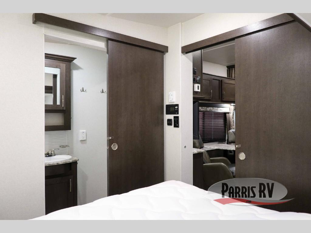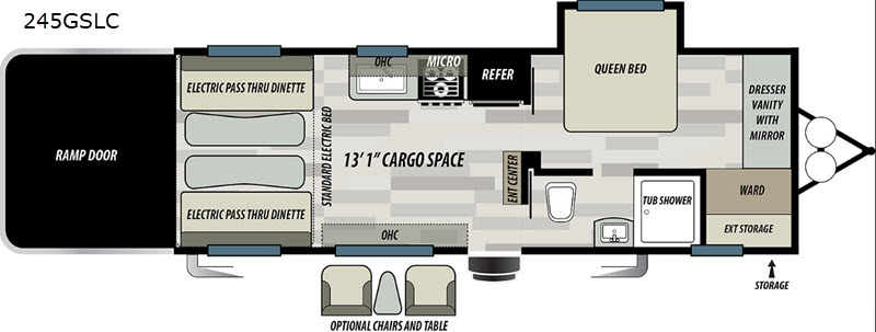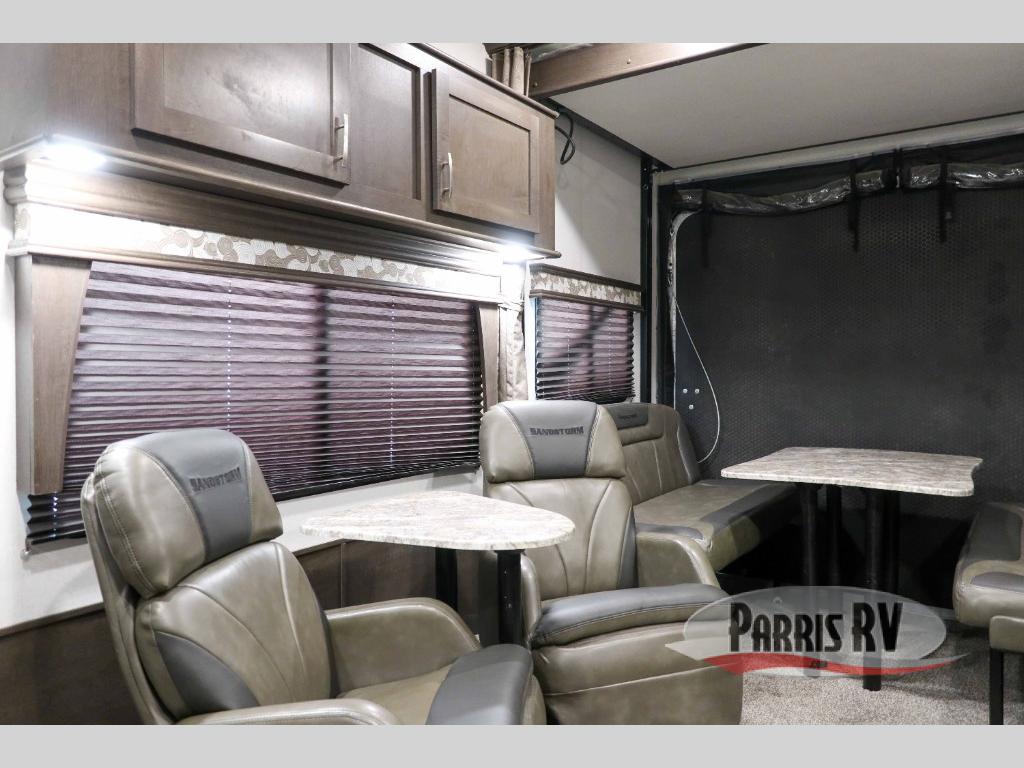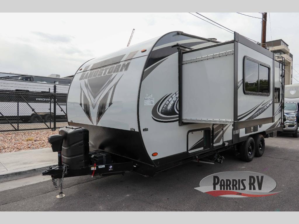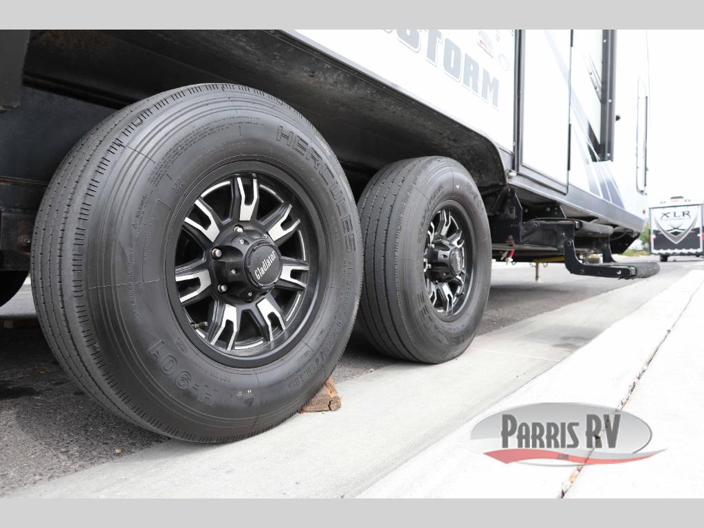 This Sandstorm toy hauler features a front private bedroom that is fit for a Queen with a queen-size bed, a dresser vanity with mirror, a wardrobe, and access into the dual entry bath! There is plenty of storage inside and out between the overhead cabinets and front outside storage area. After you have whipped up your best meal inside the complete kitchen you can head to the rear and relax on one of the two electric pass-thru dinettes!