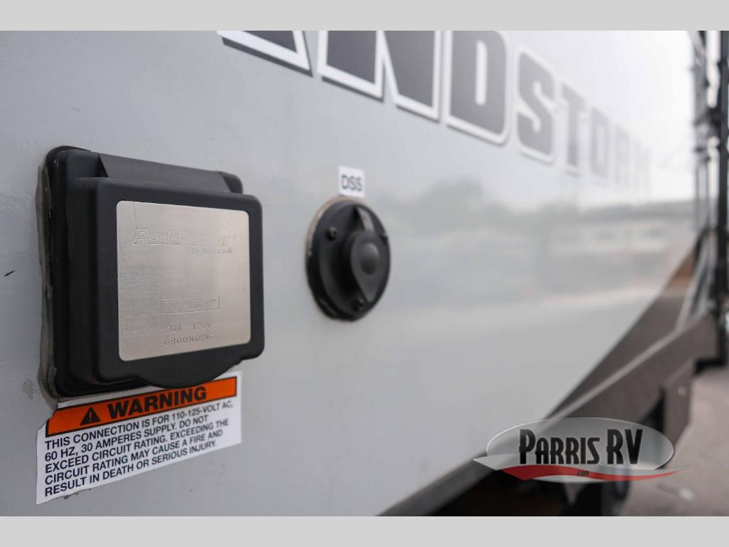 Every one of these Sandstorm travel trailer toy haulers feature a 102" wide body construction to really pack in all of the features! You can easily load up your favorite off-road toys thanks to the 3,000 lb. ramp door with patio cables and the beaver tail floor (per floorplan), plus the interior tie downs are mounted to steel so you can be sure your toys will arrive safely too. There are plenty of interior features to make this your home away from home, features like the residential queen mattress and the lighted LG solid surface kitchen countertops. You will also enjoy everything the exterior has to offer from the outside shower and the electric awning with LED lights to the black frame tinted safety glass windows. So, come choose your favorite Sandstorm toy hauler and start getting it muddy today!