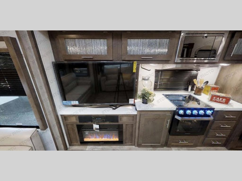 Camping is made easy with this fifth wheel! From the front private bedroom with a Maxx king bed to the kitchen island with a central trash system leading to one of the outside storage areas. The chef of your group will enjoy creating their best dishes in the executive kitchen. The oversized dinette is not only a great place to enjoy your meals, but also a good spot to play some games. If you're not one for games then you can relax on either the theater seating or the rear tri-fold sofa sleeper while you enjoy the cozy fireplace!