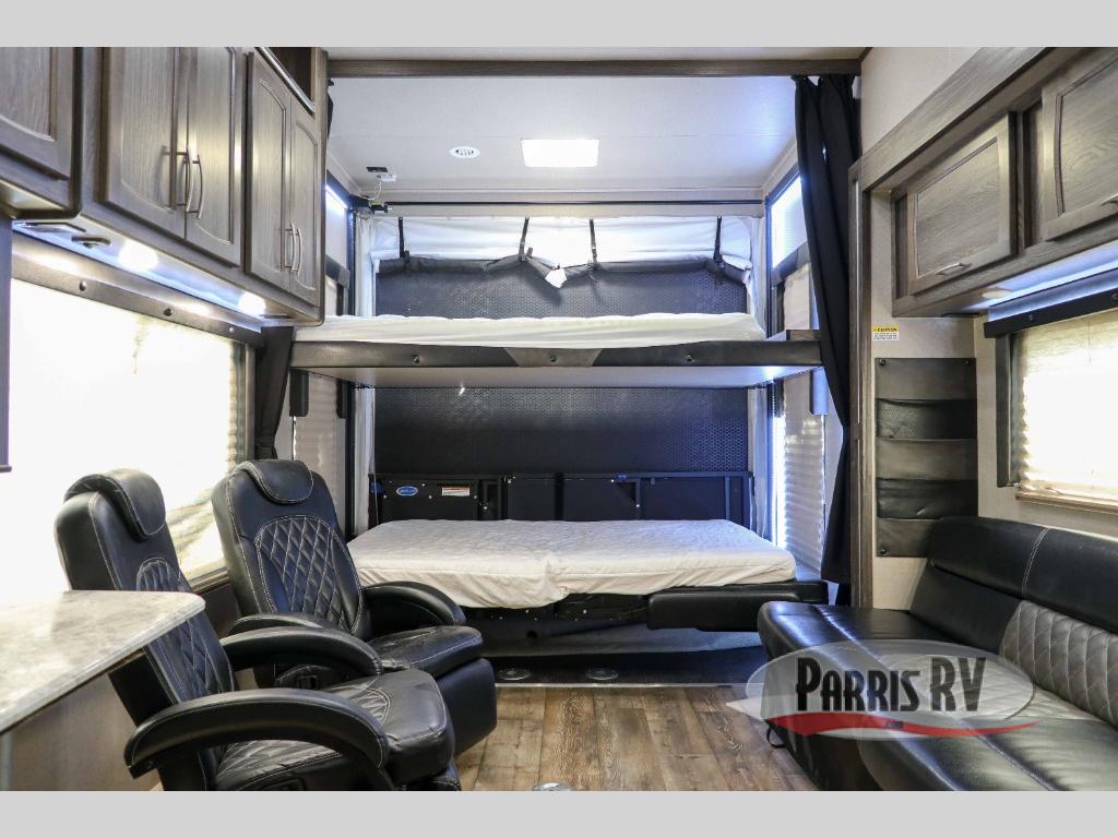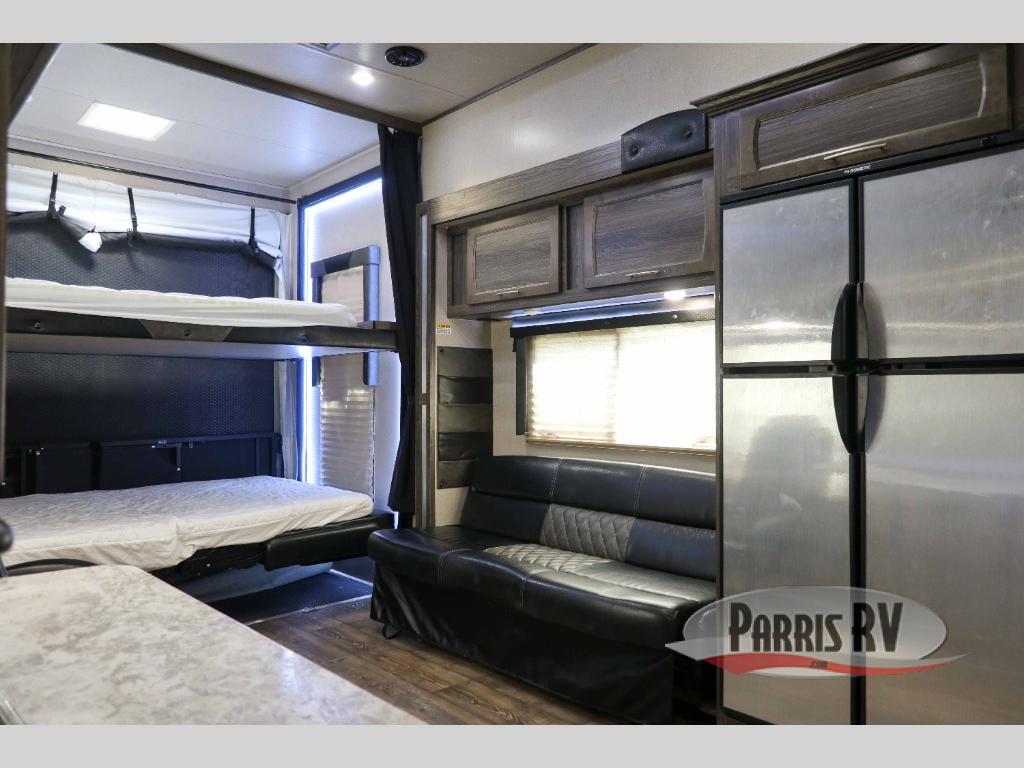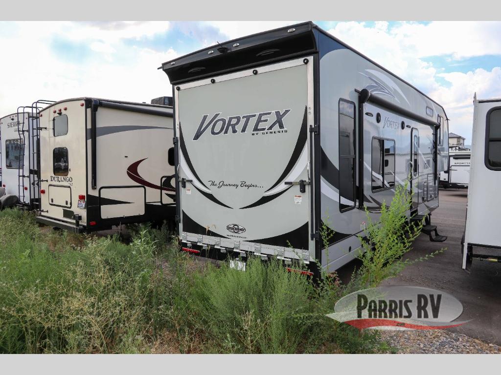 Put your toys in the 16' 8" garage and set out to the campsite with this Vortex toy hauler! Having two slides in this unit is what will allow you to live comfortably while you spend time relaxing on the two sofas and two lounge chairs. You'll definitely be appreciative that the power bunk can fold away after you wake up in the morning, and you can grab a refreshing glass of orange juice from the double-door refrigerator in the kitchen.