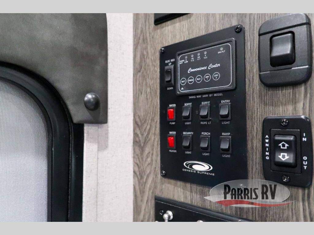 Whether you love to take some dirt bikes out on the trails, hit the lake with a couple of kayaks, or spend the winter snowmobiling throughout the slopes, the Vortex toy hauler from Genesis Supreme will give you the space you need to bring your favorite toys along with you! An exterior awning with LED lights will provide an additional space for you to party with friends, and the AM/FM/CD/DVD stereo with Bluetooth and USB will give you a chance to get that party started. The interior crown molding creates a beautiful space where you can spend your getaways, and the LED lighting will create plenty of illumination whenever you need it.