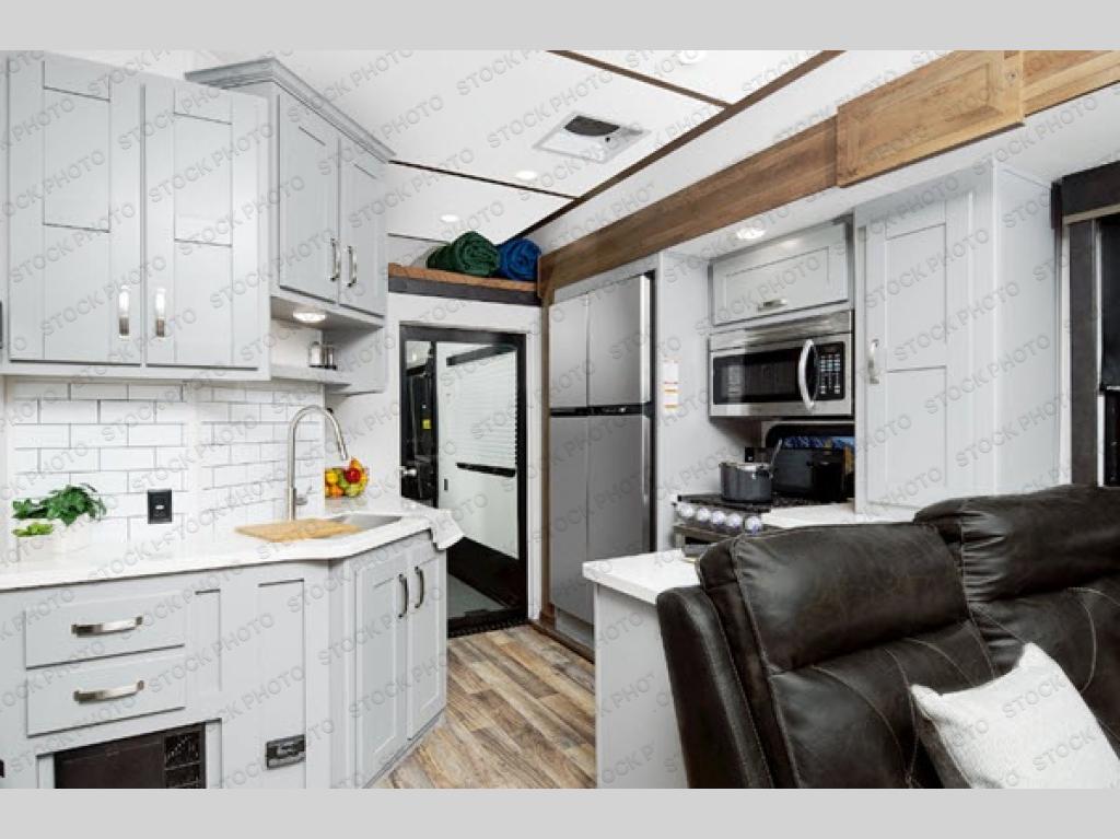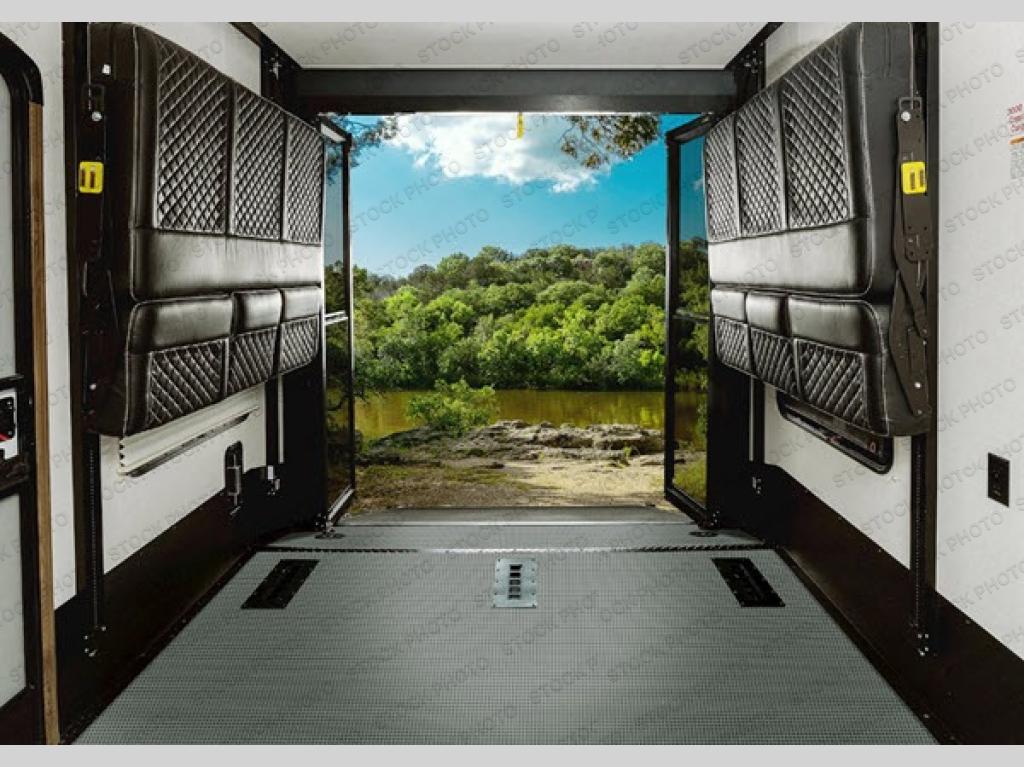 This toy hauler is sure to be a crowd pleaser! With dual opposing sofas in the garage area and the main living area, everyone will have a comfortable place to sit during the day and sleep at night. You can whip up all of your best meals with the three burner Furrion oven and you can easily serve it thanks to the all of the counter space next to the oven, as well as around the sink. Inside the front private bedroom there is a residential queen bed for you to enjoy a good night's rest on, a large wardrobe slide out to keep your hang up clothes wrinkle free, and access into the dual entry bathroom too!
