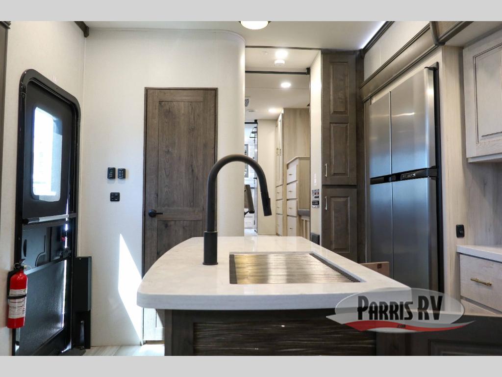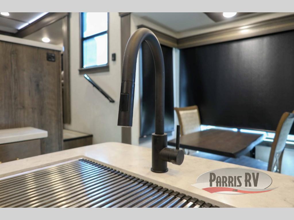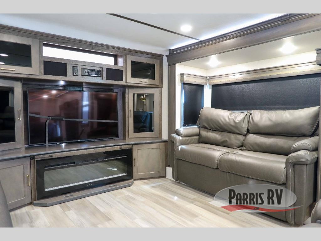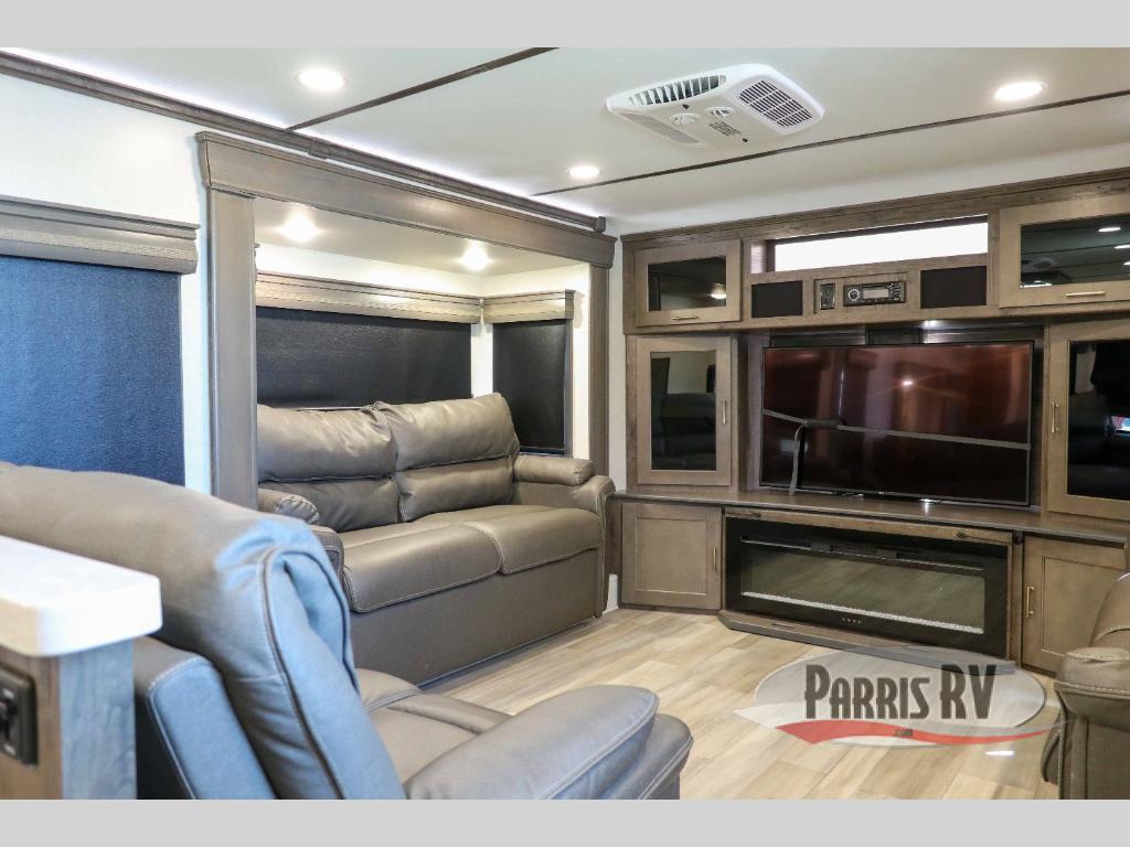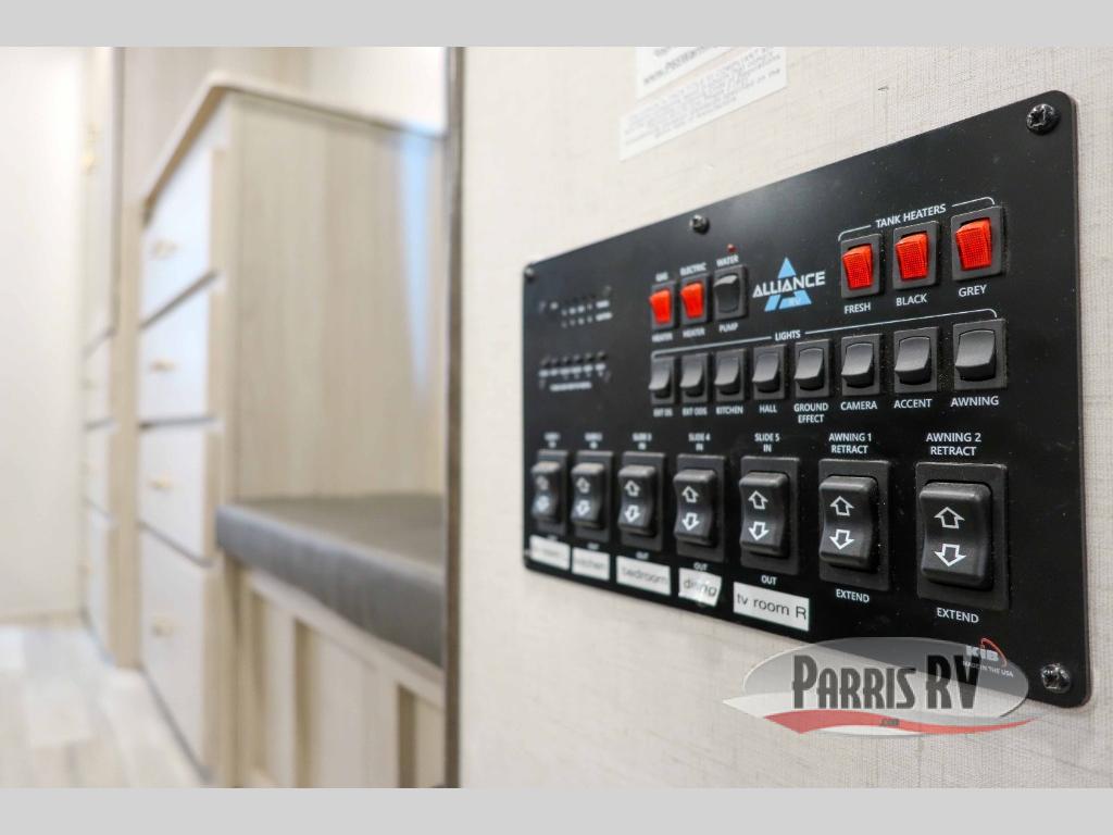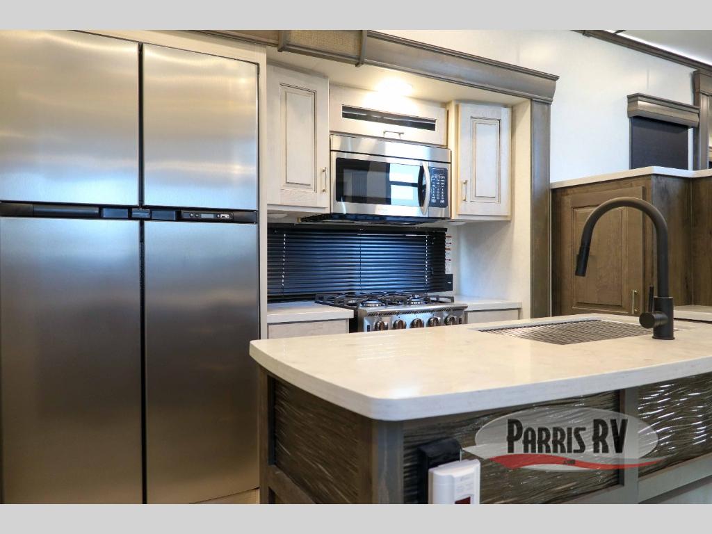 The Paradigm fifth wheel from Alliance RV is absolutely a dream to own because it combines high quality and luxury with features that you have specifically requested over the years! Some of the exterior customer-driven features are the Benchmark chassis, the G-range tires rated at 4,400 pounds, and the MorRyde CRE3000 suspension, and the Paradigm offers some of the industry's largest tank sizes at 98 gallons for fresh water and 106 gallons for gray water. The PVC roof covering will do an excellent job at protecting your RV from water intrusion, and it has increased solar reflectivity. You won't find any carpet in the Paradigm, and another great feature that has been reconstructed to meet the customer's needs is the flush-floor slide. The soft-close doors and drawers with magnetic catch are a high-end residential feature that isn't typically found on other RVs, and the excellent hidden storage capabilities of the Paradigm will surprise you when you find them.