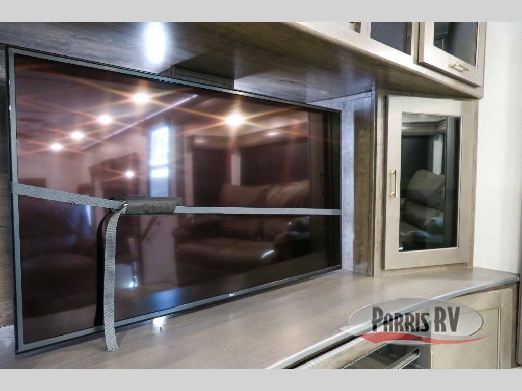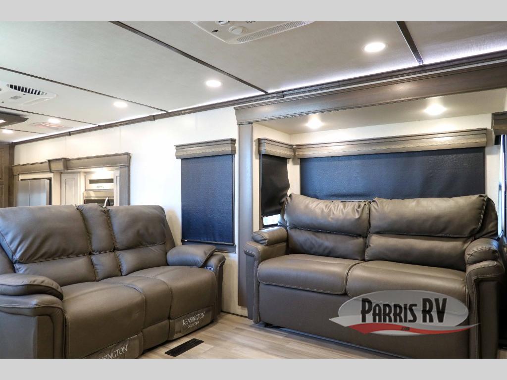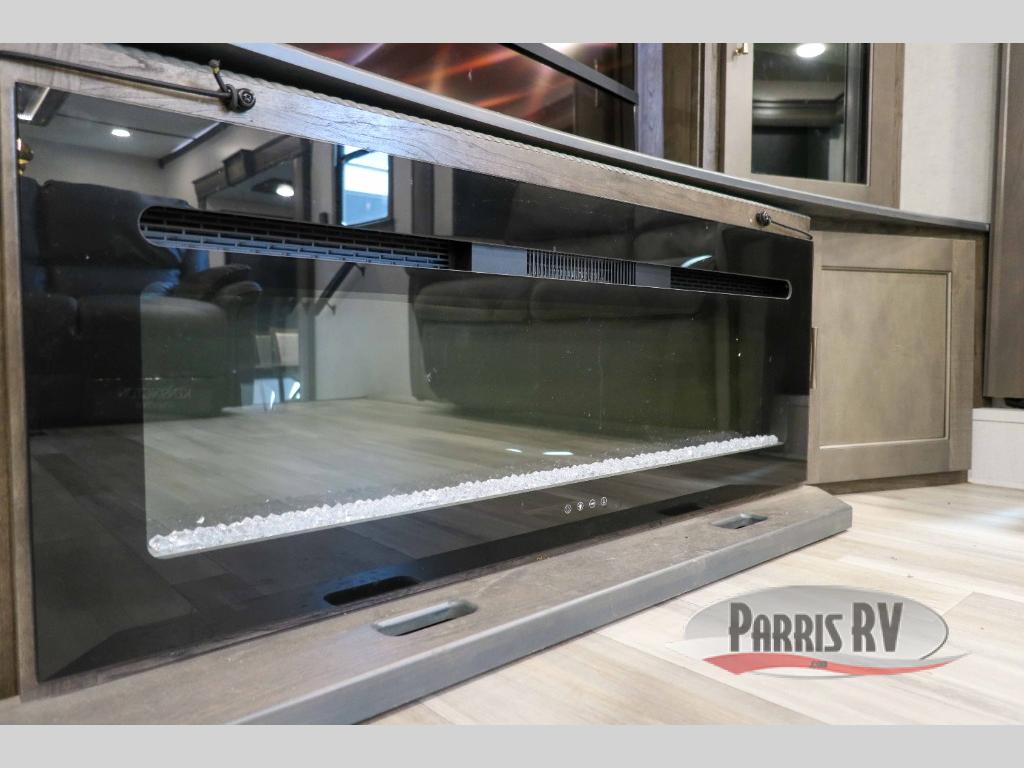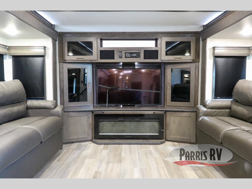 One of the most intriguing features on this Paradigm fifth wheel is the 48" x 115" basement pull-out tray because it can easily transport two kayaks! This unit also has some other extremely useful features scattered all throughout, like the preparations for a dishwasher in the kitchen, the under-step shoe storage, the dual recliner love seat in the front living room, and the pull-out fireplace at the front entertainment center. There are two Smart HDTVs in this unit so that you can enjoy a movie at the end of a long day, and the king-size bed is going to be ultra relaxing.